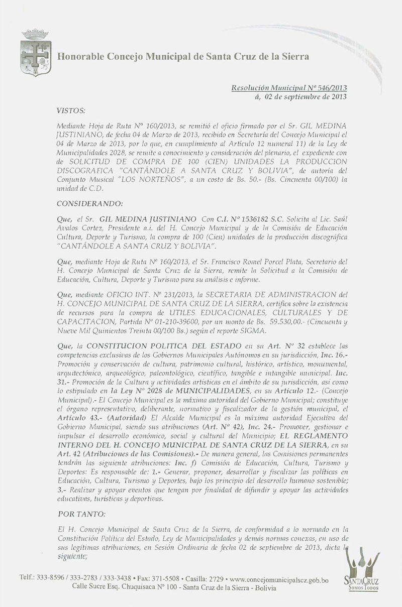Aprueba la compra de 100 CDs, que contiene la producción discográfica "Cantándole a Santa Cruz y Bolivia" a favor del Sr. Gil Médina Justiniano, por el precio de Bs. 50.- la unidad.