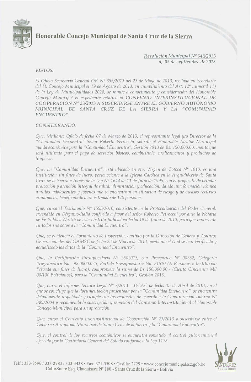 Aprueba el Convenio Interinstitucional de Cooperación Nº 023/2013, de apoyo económico a favor de la Comunidad Encuentro.