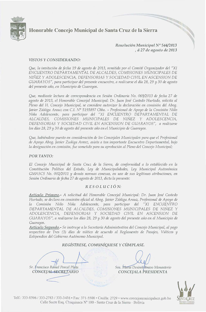 Declara en comisión oficial al Abog. Javier Zuñiga Arauz, Profesional de Apoyo de la Comisión Niño, Niña Adolescente, para que participe del "XI Encuentro Departamental de Alcaldes, Comisiones Municipales de la Niñez, Defensorías y Sociedad Civil", a realizarse en Ascensión de Guarayos.