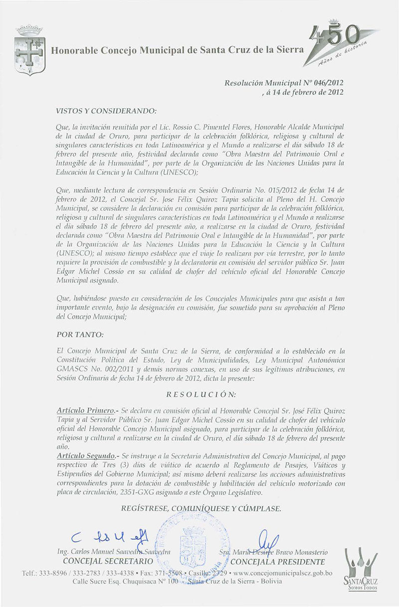 Declara en comisión oficial al Concejal Sr. José Félix Quiroz Tapia y al Servidor Público Sr. Juan Edgar Michel Cossío en calidad de chofer del vehículo del Concejo Municipal asignado, para participar de la celebración folklórica, religiosa y cultural a realizarse en la ciudad de Oruro.