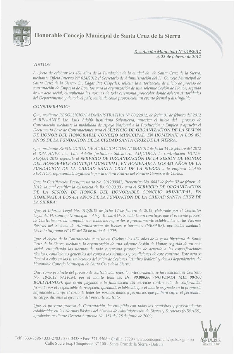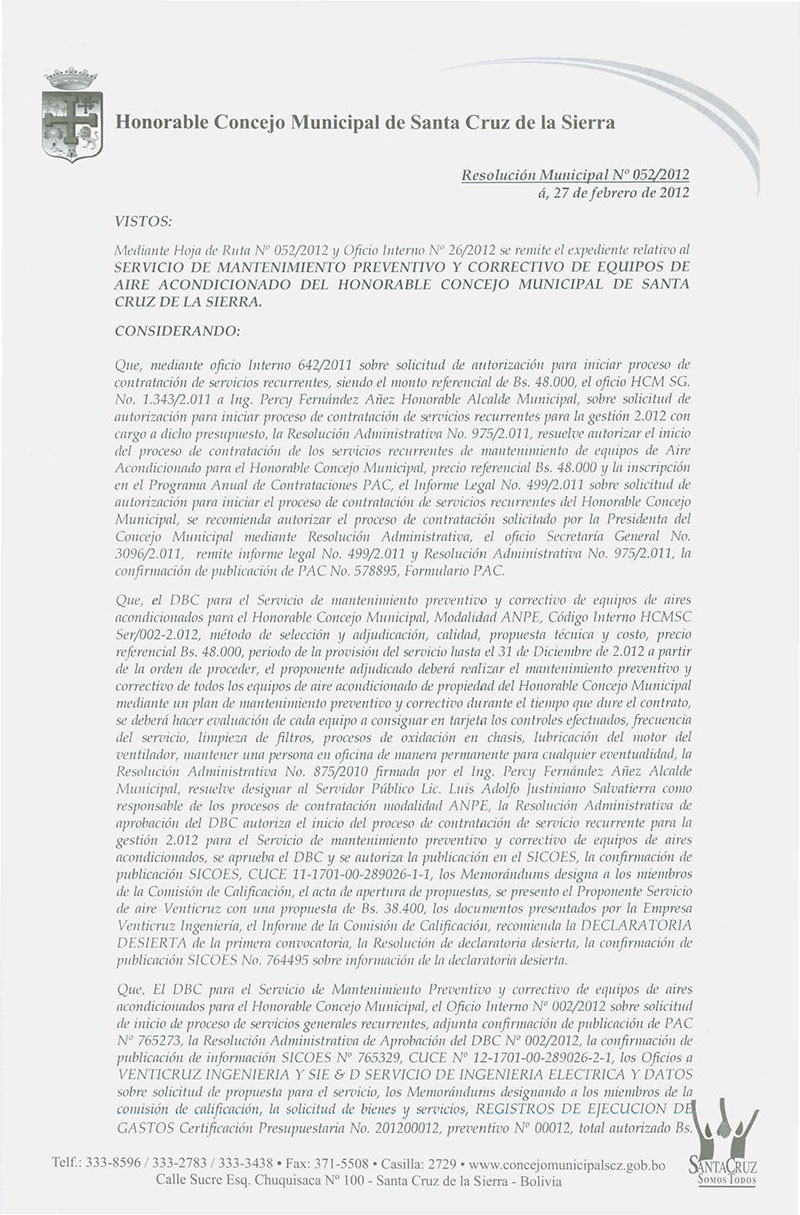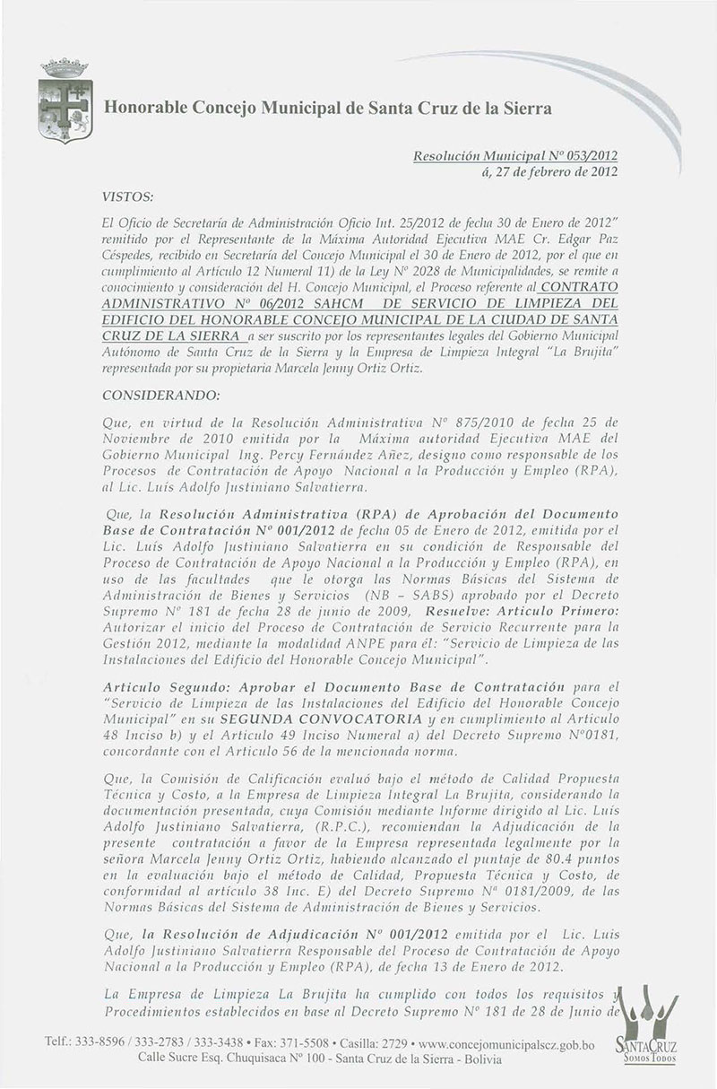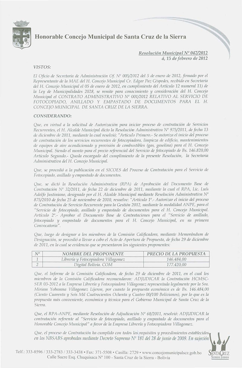 Aprueba el Contrato Administrativo Nº 01/2012, relativo al SERVICIO DE FOTOCOPIADO, ANILLADO Y EMPASTADO DE DOCUMENTOS PARA EL HONORABLE CONCEJO MUNICIPAL DE SANTA CRUZ, por el monto de Bs. 146.484,00.