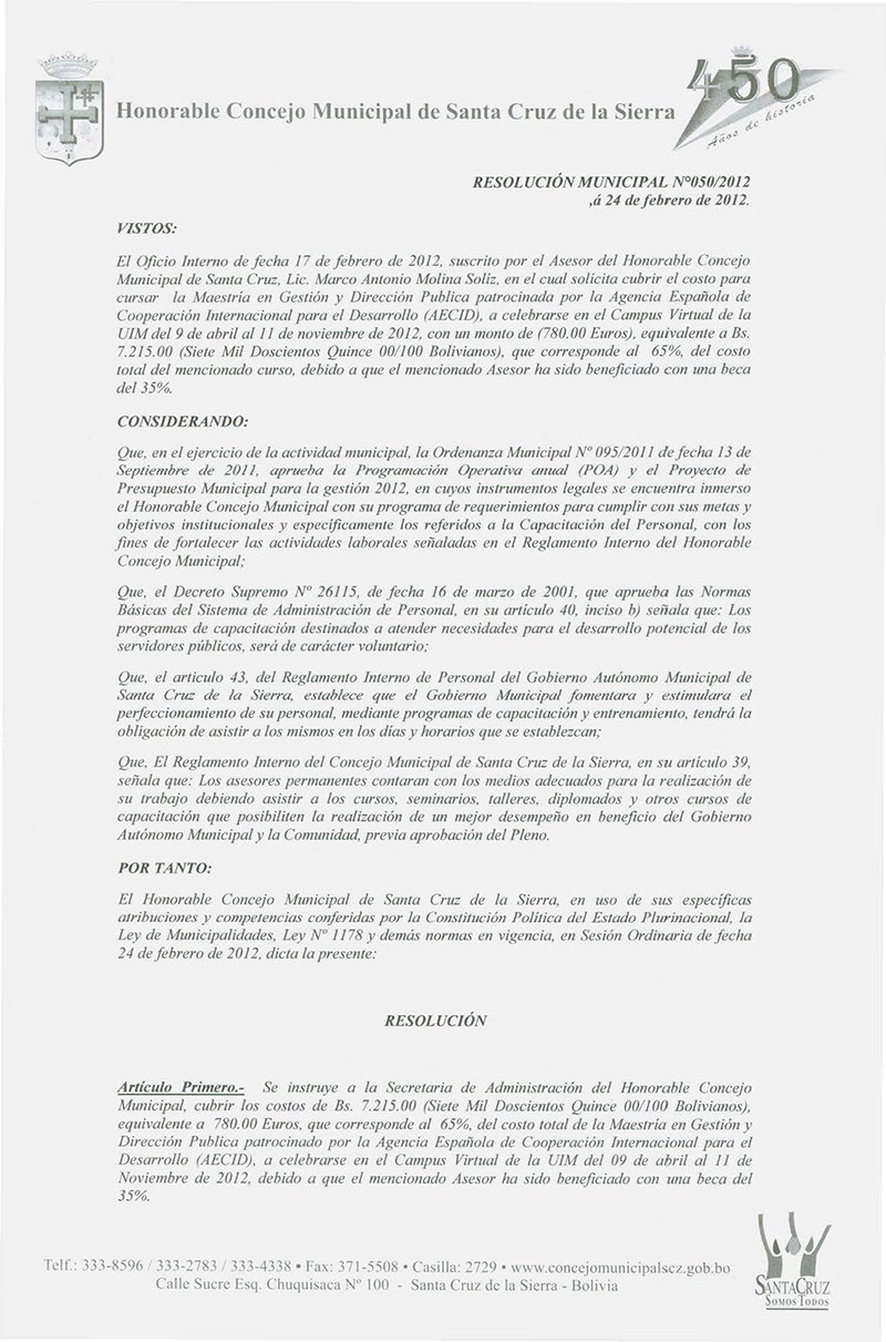 Instruye a la Secretaria de Administración del H. Concejo Municipal, cubrir los costos que corresponde al 65%, del costo total de la Maestría en Gestión y Dirección Publica patrocinado por la Agencia Española de Cooperación Internacional para el Desarrollo (AECID para el Lic. Marco Antonio Molina Solíz.