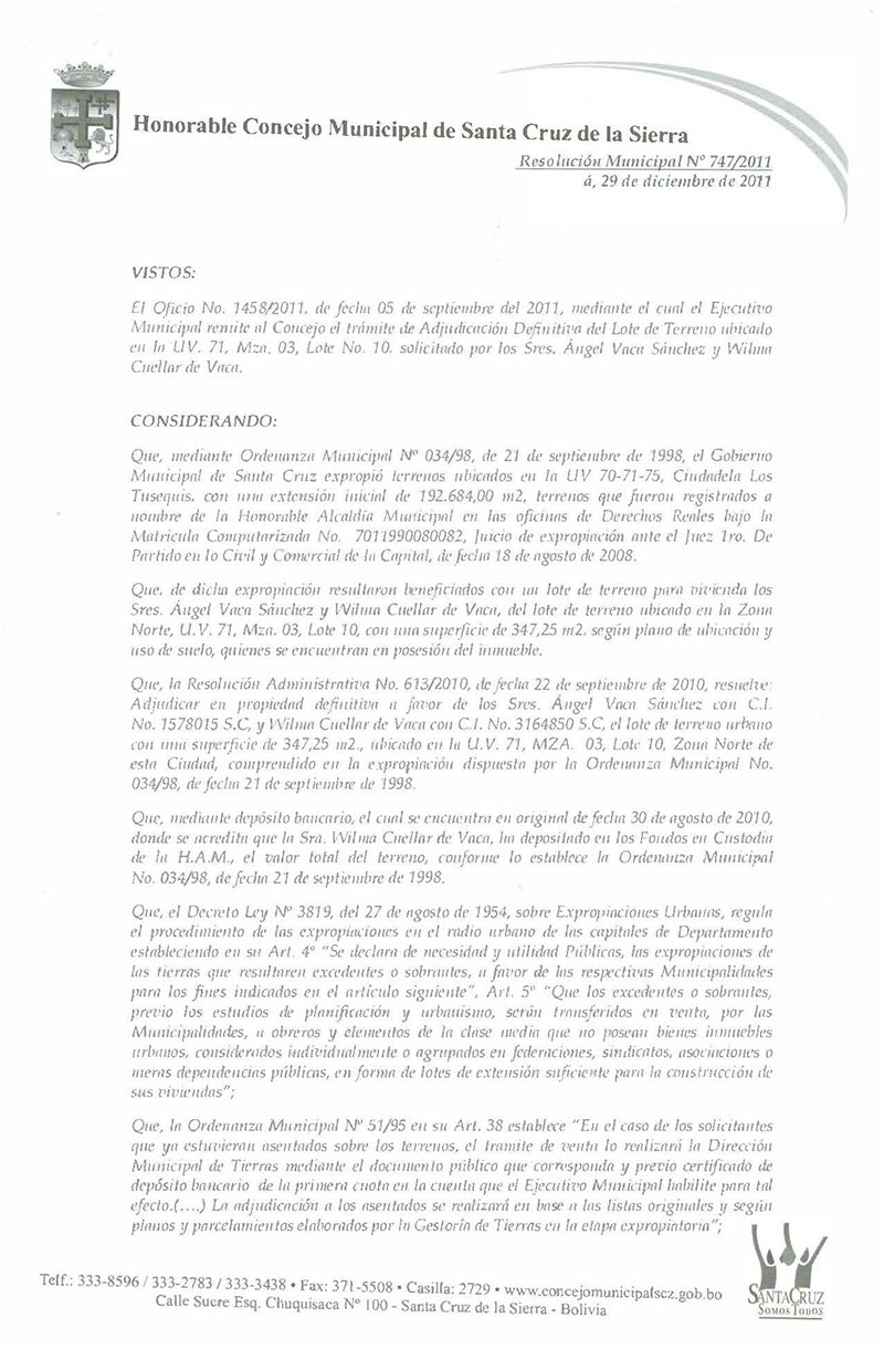 Aprueba la Minuta de Adjudicación Definitiva de Terreno, a favor de los Sres. Ángel Vaca Sánchez y Wilma Cuellar de Vaca, del lote de terreno ubicado en la UV-71, Mza. 03, Lote Nº 10.