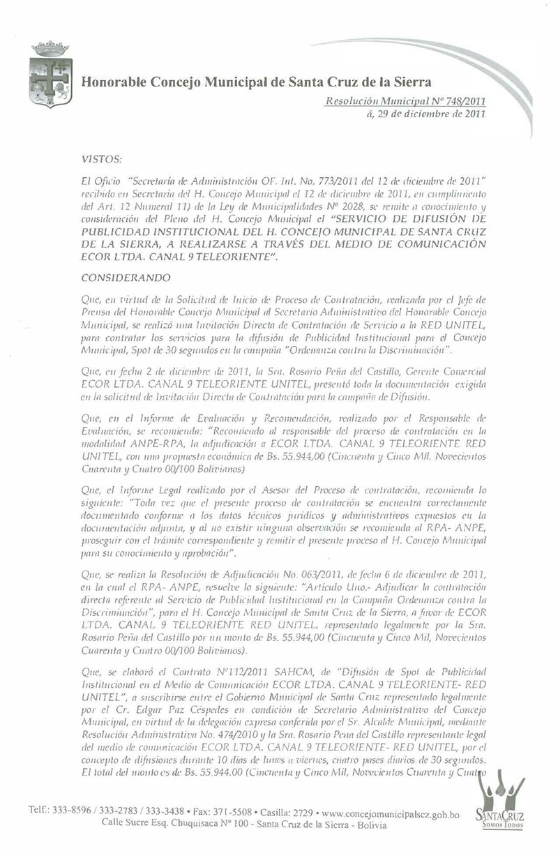 Aprueba el Contrato No. 112/2011, para la Contratación Directa del “Servicio de Difusión de Publicidad Institucional del H. Concejo Municipal de Santa Cruz.