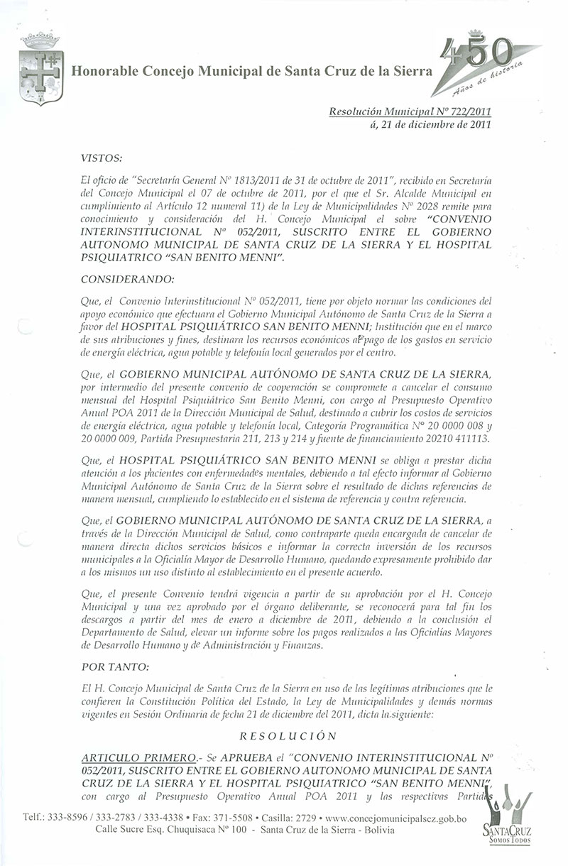Aprueba el CONVENIO INTERINSTITUCIONAL Nº 052/2011, de ayuda económica, suscrito con el HOSPITAL PSIQUIATRICO SAN BENITO MENNI.