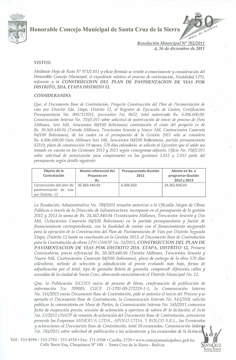 Aprueba el Contrato Modalidad Licitación Pública Nacional, OMOP No. 72/2011, Primera Convocatoria, relativo al Contrato de Obras para la Construcción del Plan de Pavimentación de Vías por Distrito 2da. Etapa Distrito 12, por el monto de Bs. 25.522.961,05.