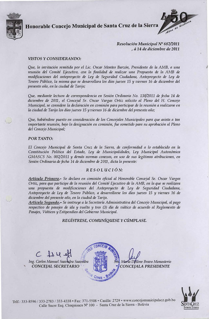 Declara en comisión oficial al Concejal Sr. Oscar Vargas Ortiz, para que participe de la reunión del Comité Ejecutivo de la AMB, en la que se realizara una propuesta de modificaciones del Anteproyecto de Ley de Seguridad Ciudadana, Anteproyecto de Ley de Tesoro Público, a desarrollarse en la ciudad de Tarija.