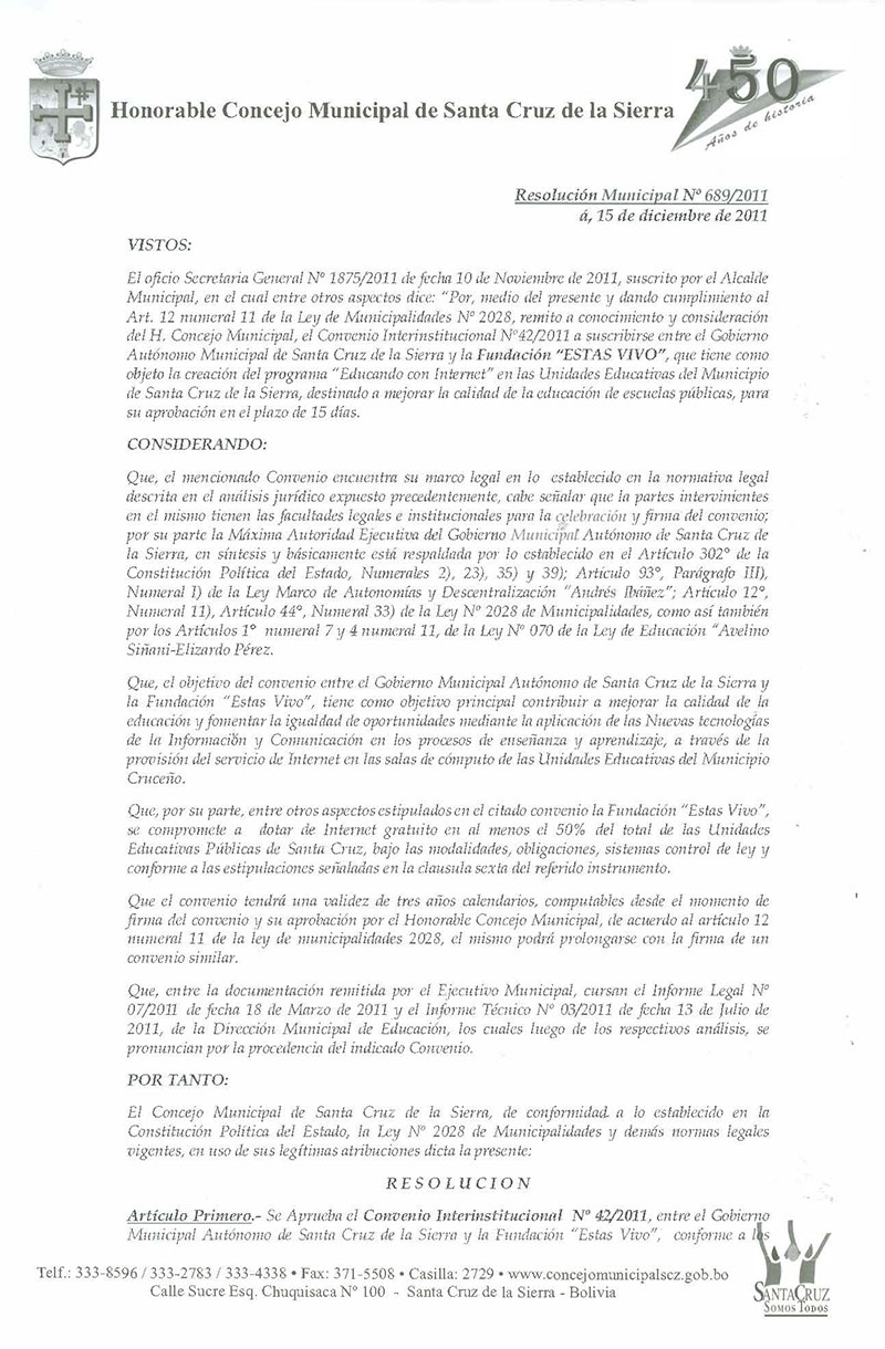 Aprueba el Convenio Interinstitucional Nº 42/2011, entre el Gobierno Municipal Autónomo de Santa Cruz de la Sierra y la Fundación “Estas Vivo”.