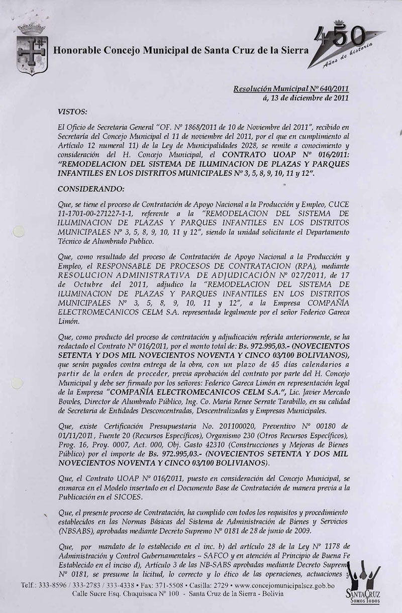 Aprueba el Contrato UOAP No. 016/2011, para la “REMODELACION DEL SISTEMA DE ILUMINACION DE PLAZAS Y PARQUES INFANTILES EN LOS DISTRITOS MUNICIPALES Nº 3, 5, 8, 9, 10, 11 y 12”, por Bs. 972.995,03.