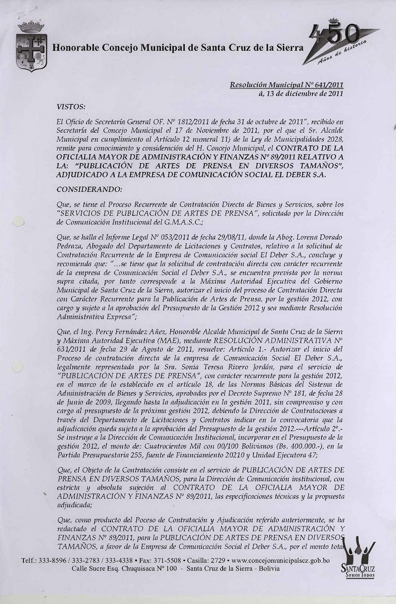 Aprueba el CONTRATO OMAF Nº 89/2011, para la PUBLICACIÓN DE ARTES DE PRENSA EN DIVERSOS TAMAÑOS, a favor de la Empresa de Comunicación Social El Deber S.A, por el monto de Bs. 400.000,00. (CUATROCIENTOS MIL 00/100 BOLIVIANOS).