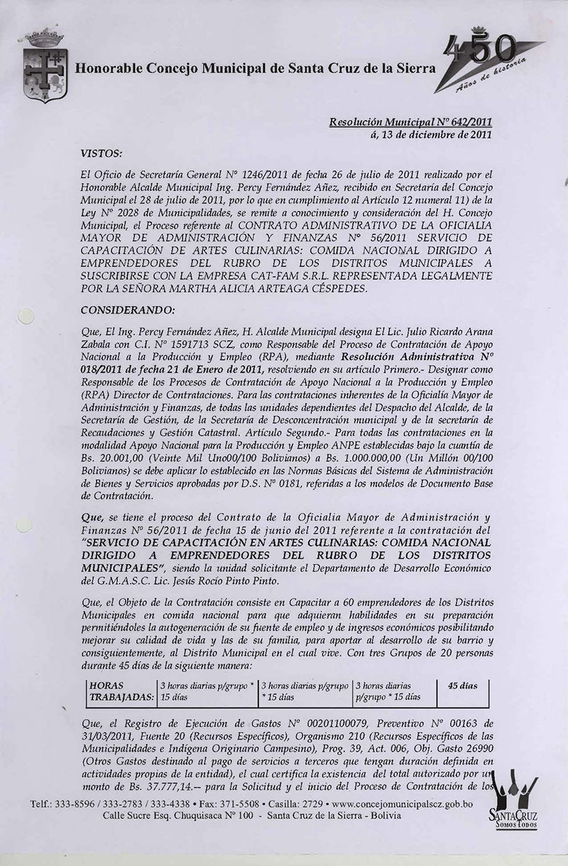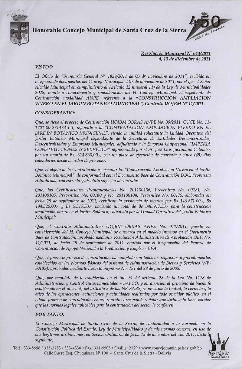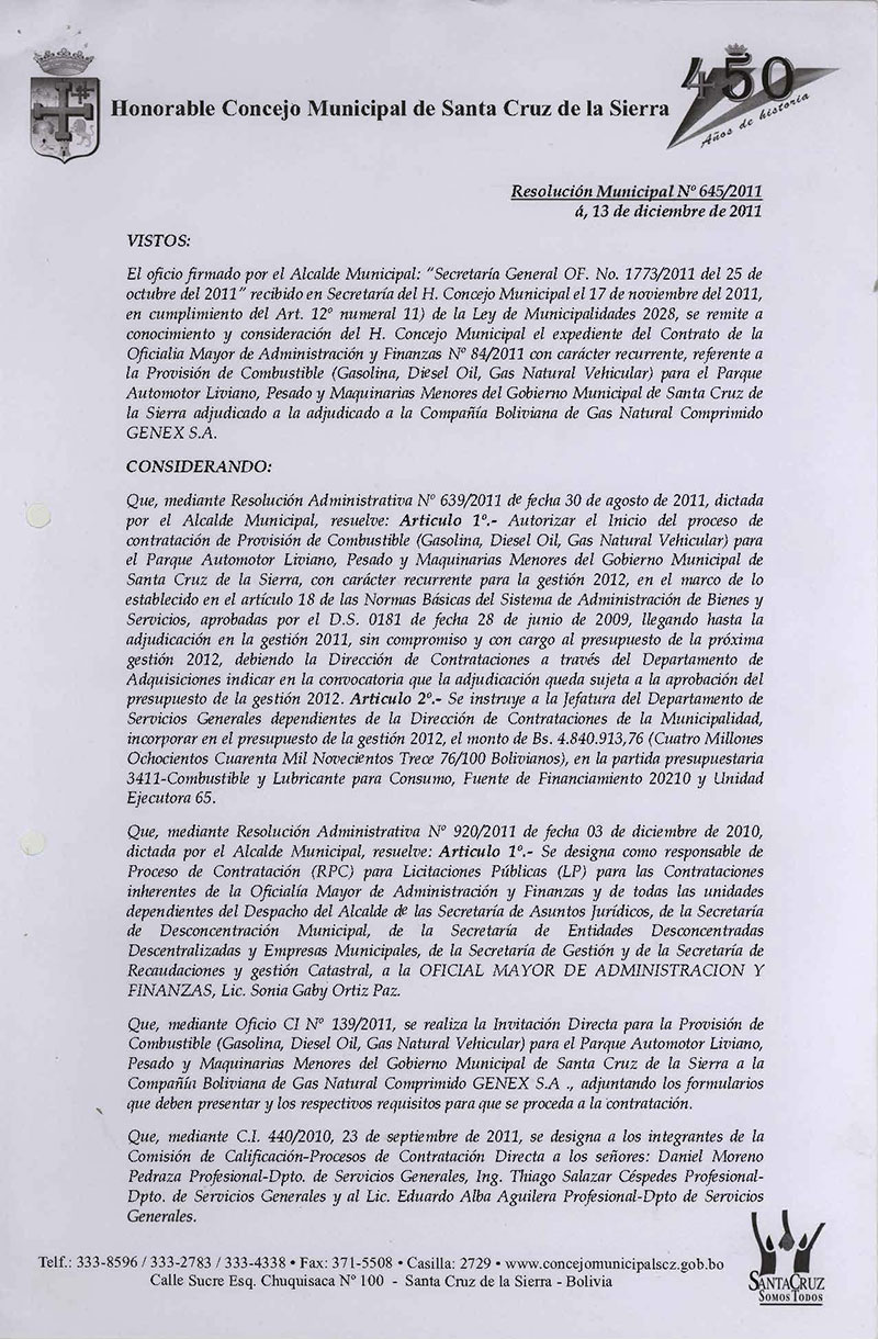 Aprueba el Contrato OMAF Nº 84/2011, referente a Servicios de “Provisión de Combustible (Gasolina, Diesel Oil, Gas Natural Vehicular) para el Parque Automotor Liviano, Pesado y Maquinarias Menores del Gobierno Municipal de Santa Cruz, por Bs. 4.840.913,76., adjudicado a la Compañia Boliviana de Gas GENEX S.A.