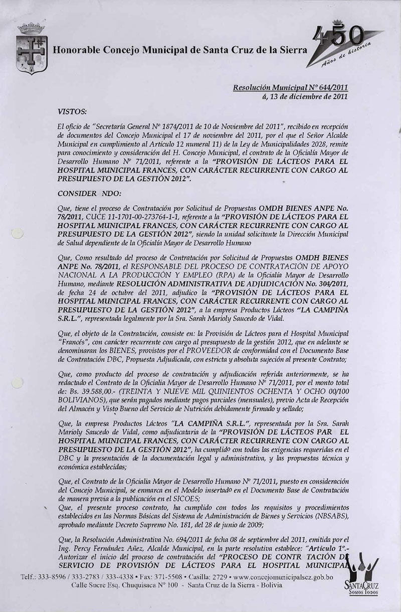 Aprueba el Contrato OMDH Nº 71/2011, para la “PROVISIÓN DE LÁCTEOS PARA EL HOSPITAL MUNICIPAL FRANCES, CON CARÁCTER RECURRENTE CON CARGO AL PRESUPUESTO DE LA GESTIÓN 2012”,.