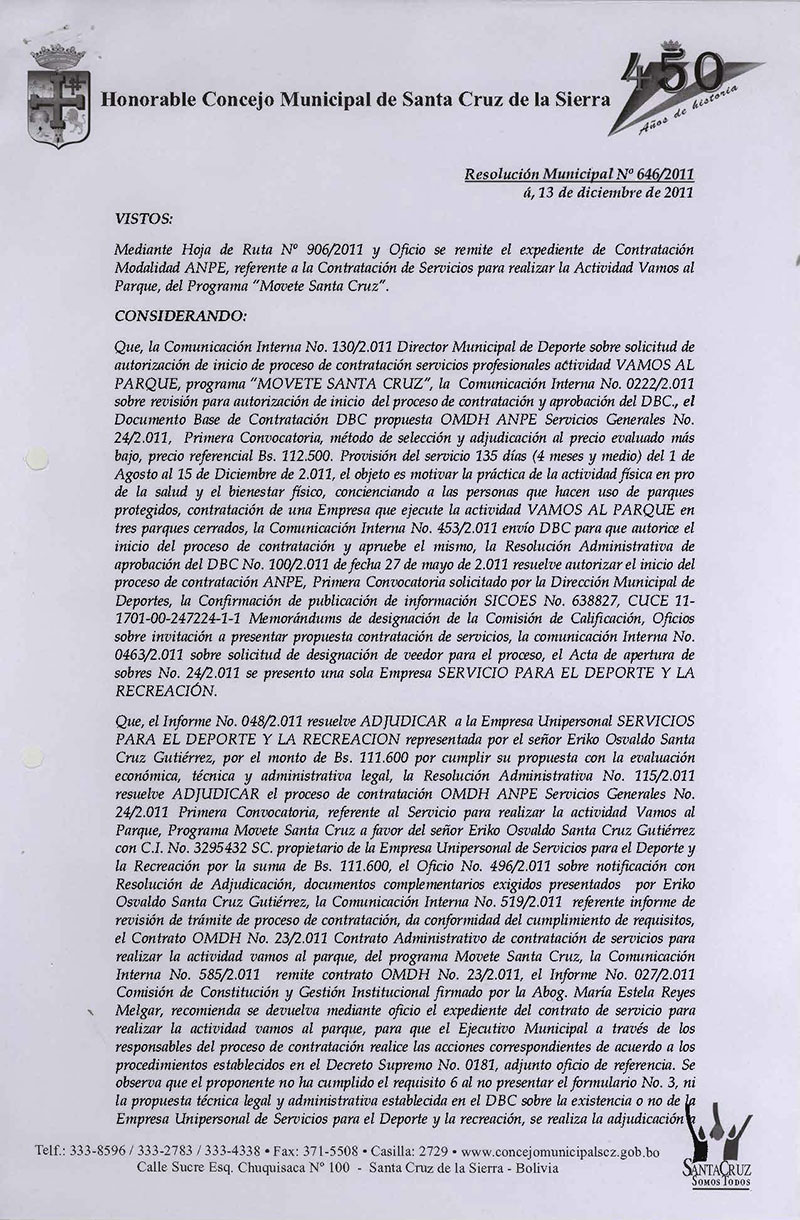 Aprueba el proceso de Contratación Modalidad ANPE N° 073/2011, referente a la “Contratación de Servicios para realizar la actividad Vamos al Parque, del Programa Movete Santa Cruz”.