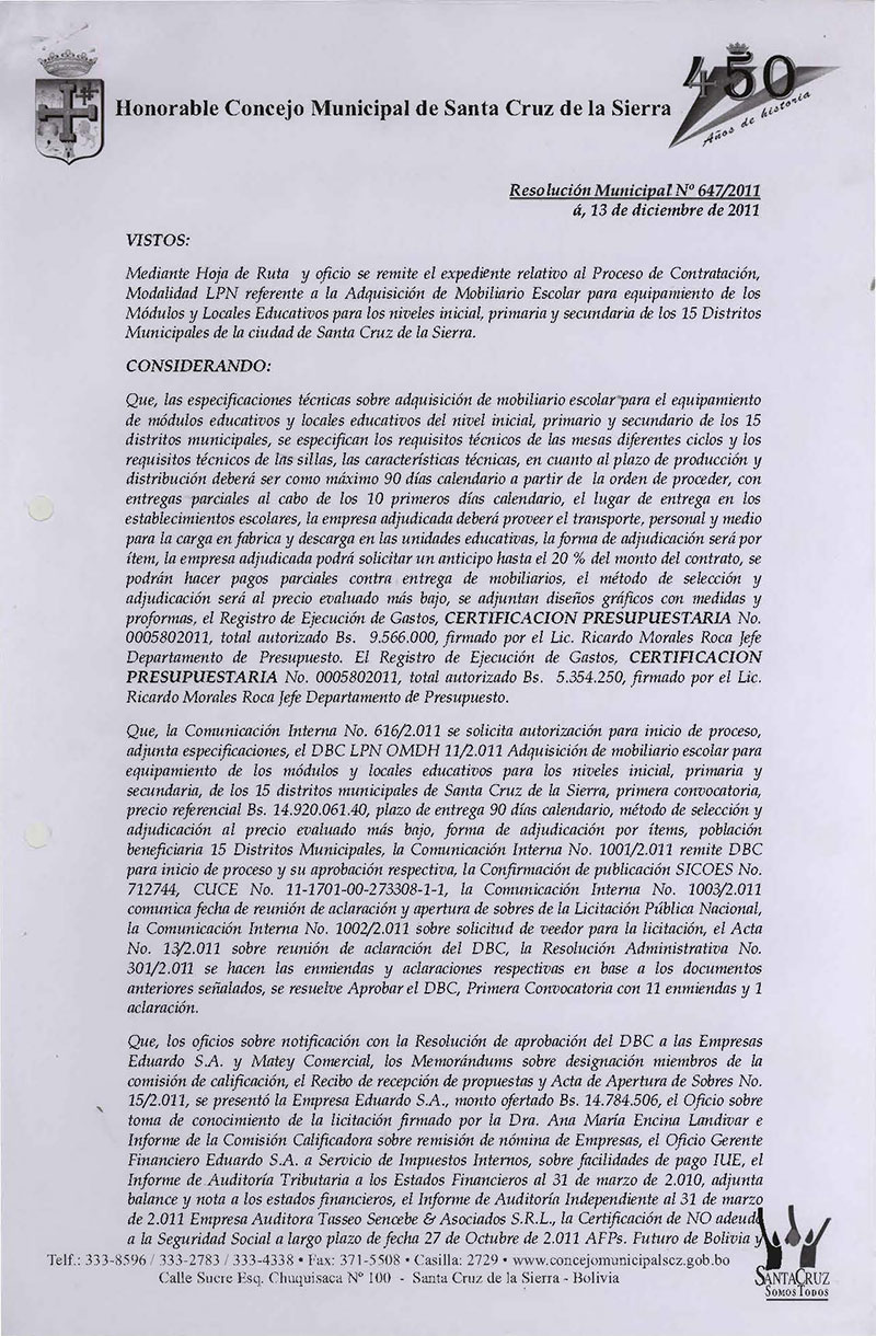 Aprueba el proceso de Contratación Modalidad LPN No. 074/2011, referente a la “Adquisición de Mobiliario Escolar para Equipamiento de los Módulos y Locales Educativos para los niveles, inicial, primaria y secundaria de los 15 Distritos Municipales, por el monto de Bs. 14.784.506.00., adjudicado a la Empresa EDUARDO S.A.