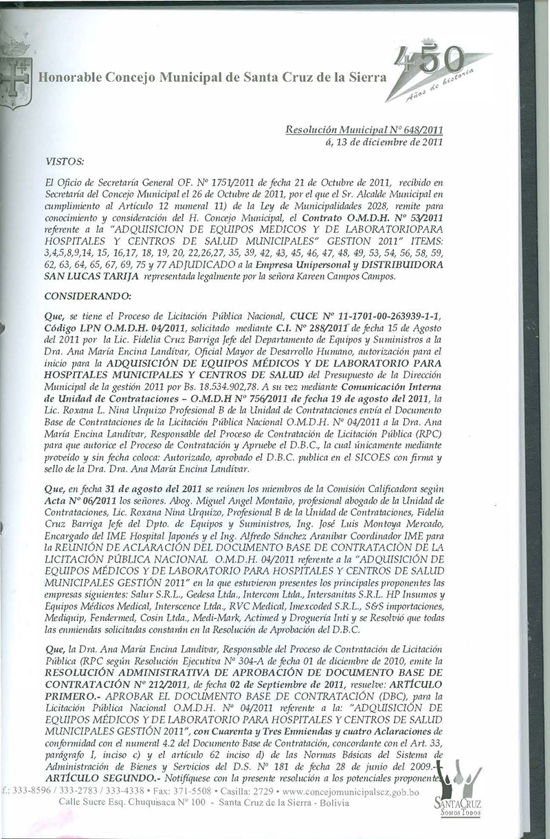 Aprueba Contrato O.M.D.H. Nº 53/2011, para la “ADQUISICION DE EQUIPOS MEDICOS Y DE LABORATORIO PARA HOSPITALES Y CENTROS DE SALUD MUNICIPALES GESTIÓN 2011”con la DISTRIBUIDORA SAN LUCAS TARIJA, por el monto de Bs. 5.334.070,00.