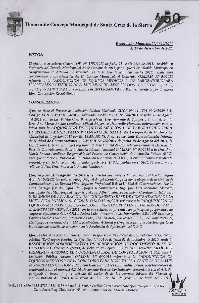 Aprueba el Contrato O.M.D.H. Nº 54/2011 referente a la “ADQUISICION DE EQUIPOS MEDICOS Y DE LABORATORIO PARA HOSPITALES Y CENTROS DE SALUD MUNICIPALES” GESTION 2011” ITEMS: 7, 10, 29, 30, 31 y 55, Adjudicado a la Empresa INTERSANITAS S.R.L., por el monto Bs. 4.302.00,00.