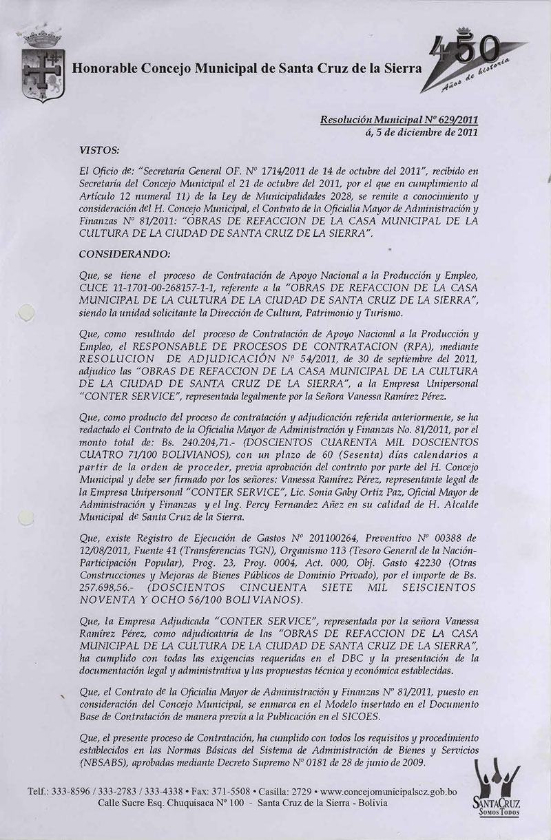Aprueba el Contrato de OMAF Nº 81/2011, para las “OBRAS DE REFACCION DE LA CASA MUNICIPAL DE LA CULTURA DE LA CIUDAD, por el monto de Bs. 240.204,71.
