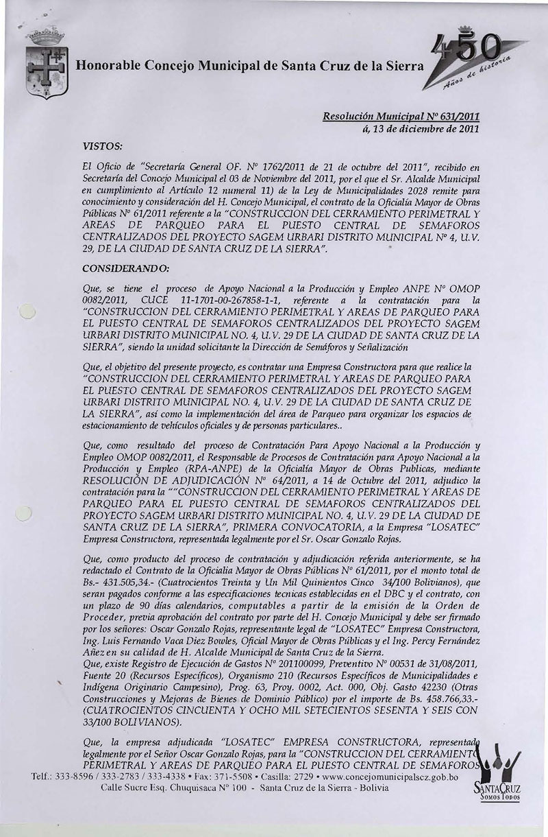 Aprueba el Contrato OMOP Nº 61/2011, para la “CONSTRUCCION DEL CERRAMIENTO PERIMETRAL Y AREAS DE PARQUEO PARA EL PUESTO CENTRAL DE SEMAFOROS CENTRALIZADOS DEL PROYECTO SAGEM URBARI, DISTRITO MUNICIPAL NO. 4, U.V. 29, por el monto de Bs. 431.505,34.