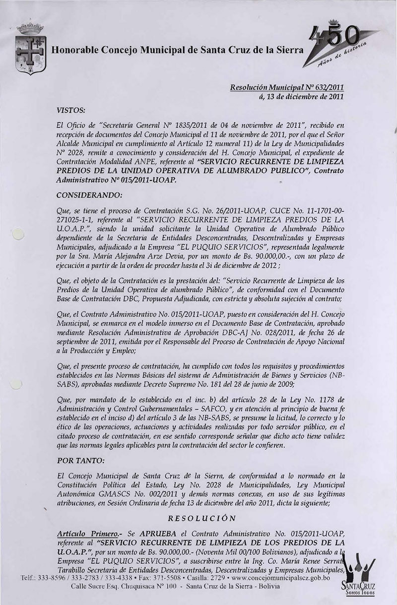 Aprueba el Contrato Administrativo No. 015/2011-UOAP, referente al “SERVICIO RECURRENTE DE LIMPIEZA DE LOS PREDIOS DE LA Unidad Operativa de Alumbrado Público”.