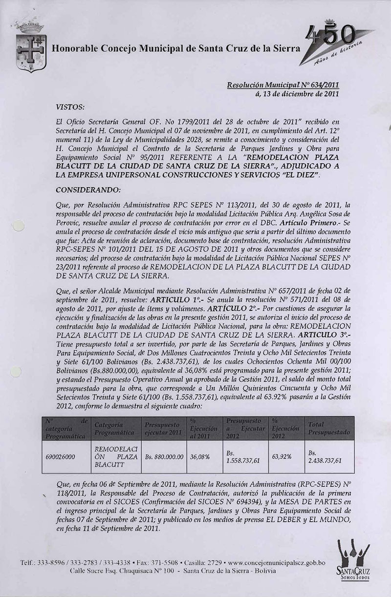Aprueba el Contrato de la Secretaria de Parques Jardines y Obras para Equipamiento Social Nº 95/2011 referente a la “REMODELACIÓN PLAZA BLACUTT", por el monto de Bs. 2.072.962,90.