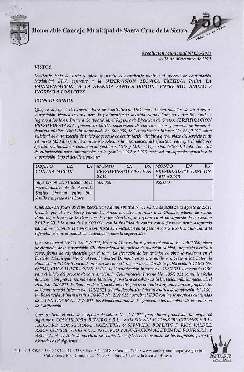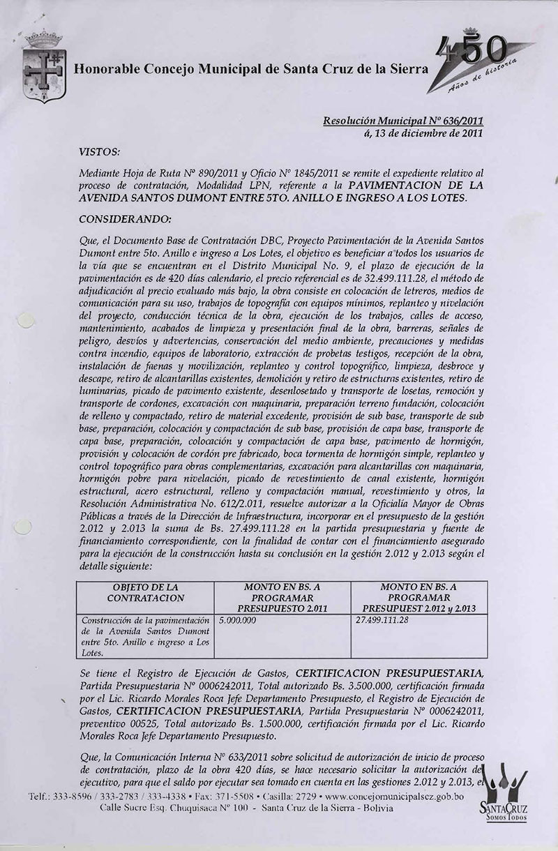 Aprueba el Contrato Modalidad Licitación Pública Nacional, OMOP Nº 62/2011, relativo al Contrato de obras para la Pavimentación Avenida Santos Dumont entre 5to. Anillo e ingreso a Los Lotes, por el monto de Bs. 26.251.390,37.