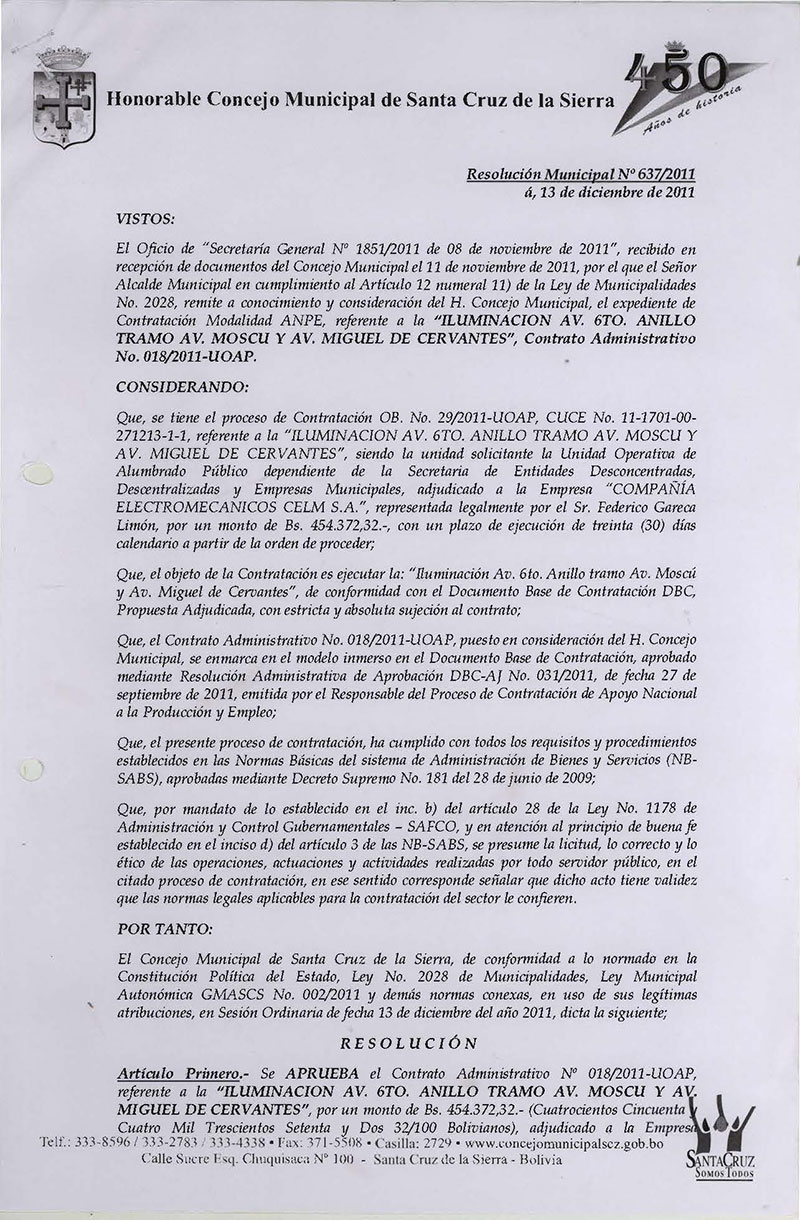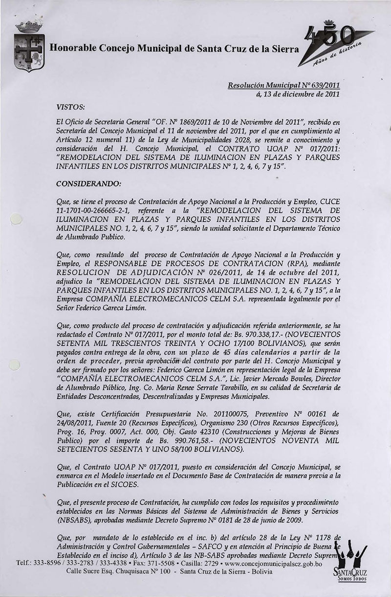 Aprueba el Contrato UOAP Nº 017/2011, para la “REMODELACION DEL SISTEMA DE ILUMINACION EN PLAZAS Y PARQUES INFANTILES EN LOS DISTRITOS MUNICIPALES Nº 1, 2, 4, 6, 7 y 15”, por el monto de Bs. 970, 338,17.