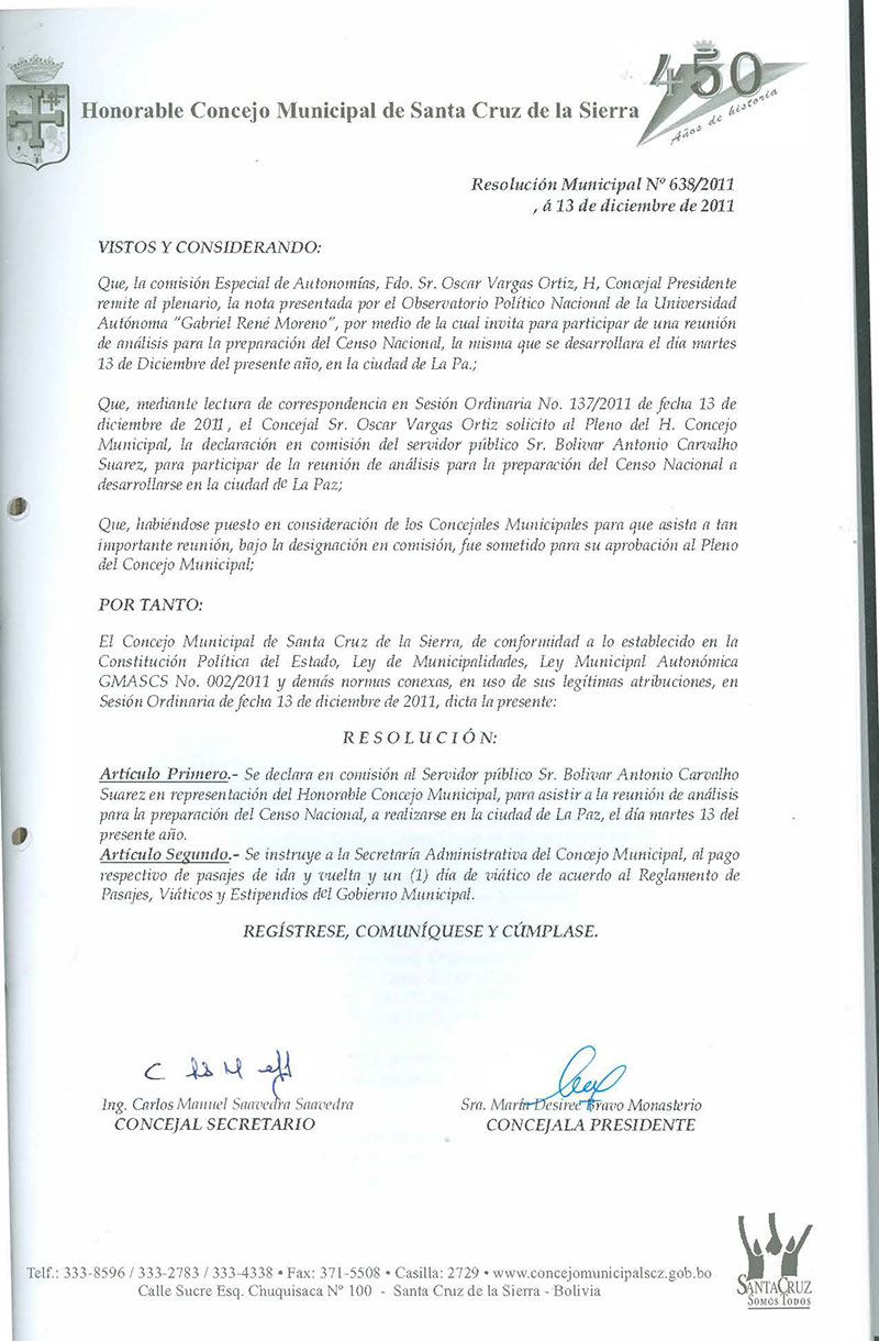 Declara en comisión al Servidor público Abog. Bolívar Antonio Carvalho, para participar de la preparación del Censo Nacional a realizarse en la ciudad de La Paz.