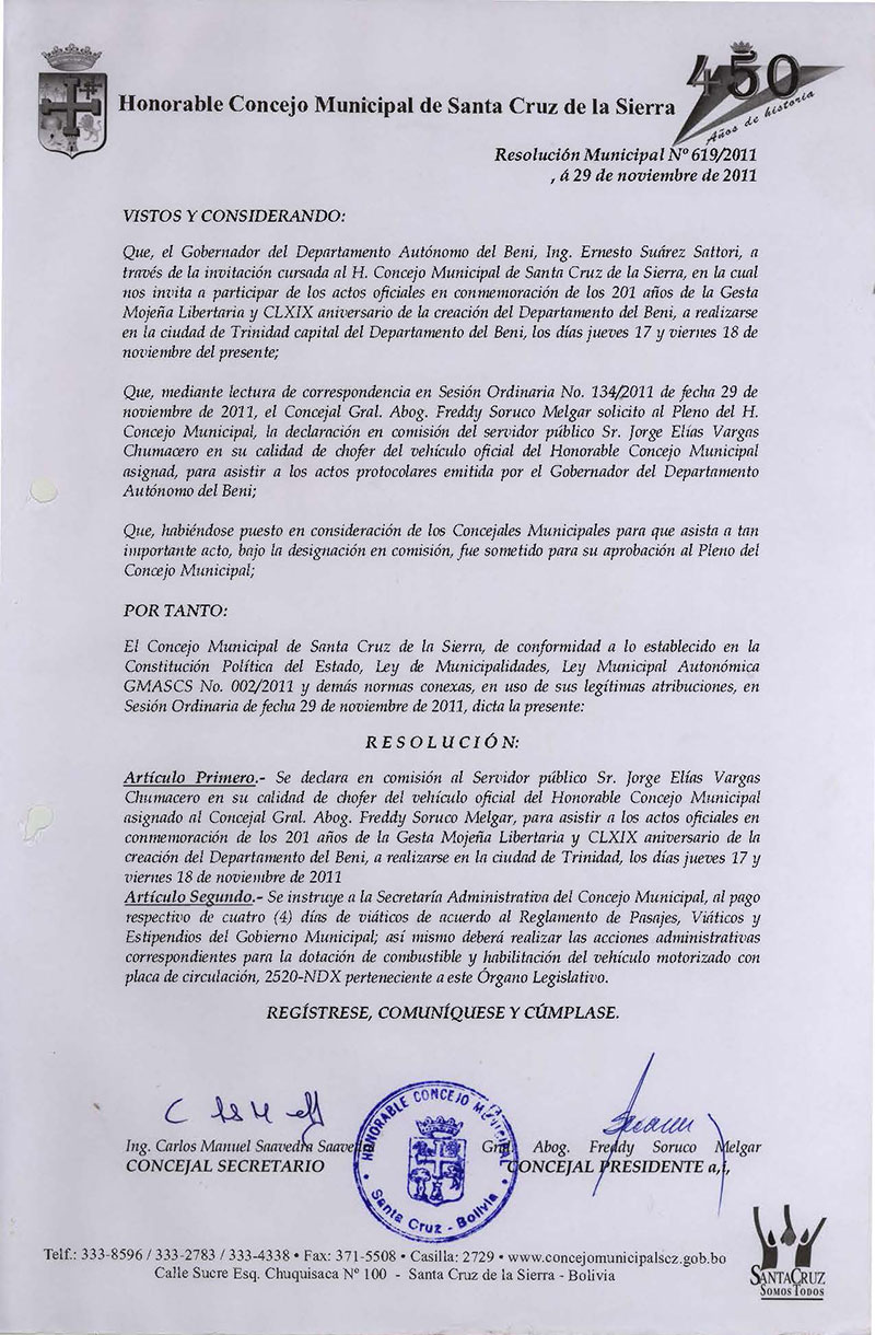 Declara en comisión a Sr. Jorge Elias Vargas- Chofer Vehículo de Gral. Soruco, para asistir a Actos protocolares a la ciudad de Beni.