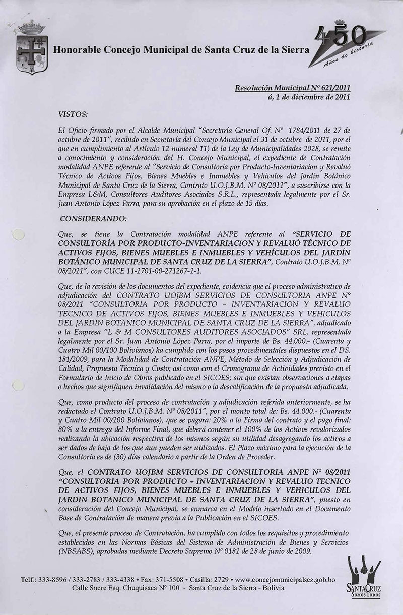 Aprueba el CONTRATO UNIDAD OPERATIVA “JARDIN BOTANICO MUNICIPAL” SERVICIOS DE CONSULTORIA ANPE N° 08/2011 “CONSULTORIA POR PRODUCTO – INVENTARIACION Y REVALUO TECNICO DE ACTIVOS FIJOS, BIENES MUEBLES E INMUEBLES Y VEHICULOS DEL JARDIN BOTANICO MUNICIPAL.