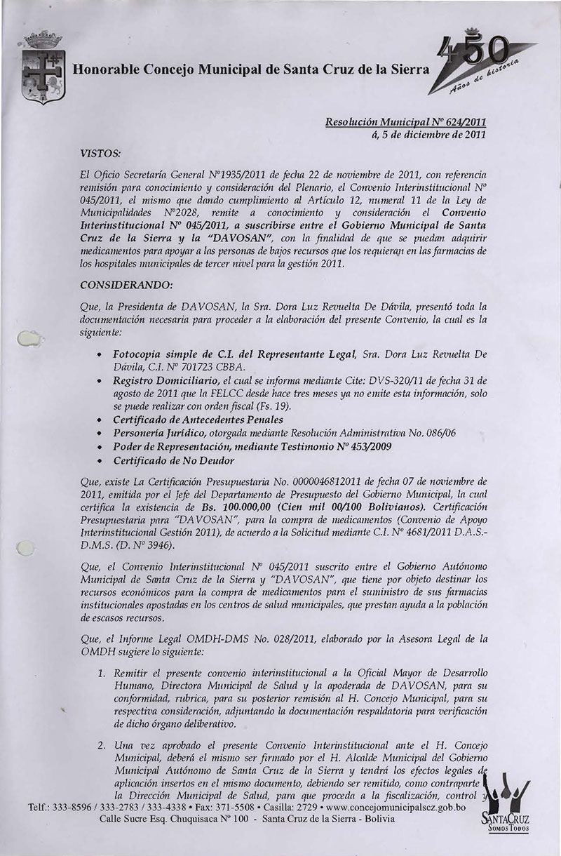 Aprueba el Convenio Interinstitucional Nº 045/2011, de apoyo económico a favor DAVOSAN.