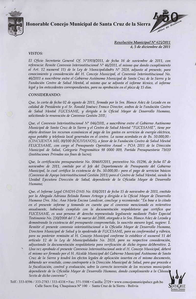 Aprueba el Convenio Interinstitucional Nº 46/2011, destinado al pago de energía eléctrica, agua potable y telefonía local, con la Fundación Centro de Salud Mental “FUCESAME”.