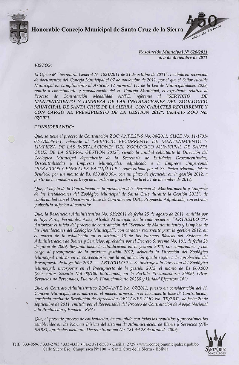 Aprueba el Contrato Administrativo ZOO-ANPE No. 07/2011, referente a “SERVICIO DE MANTENIMIENTO Y LIMPIEZA DE LAS INSTALACIONES DEL ZOOLOGICO MUNICIPAL, por el monto de Bs. 650.400,00.