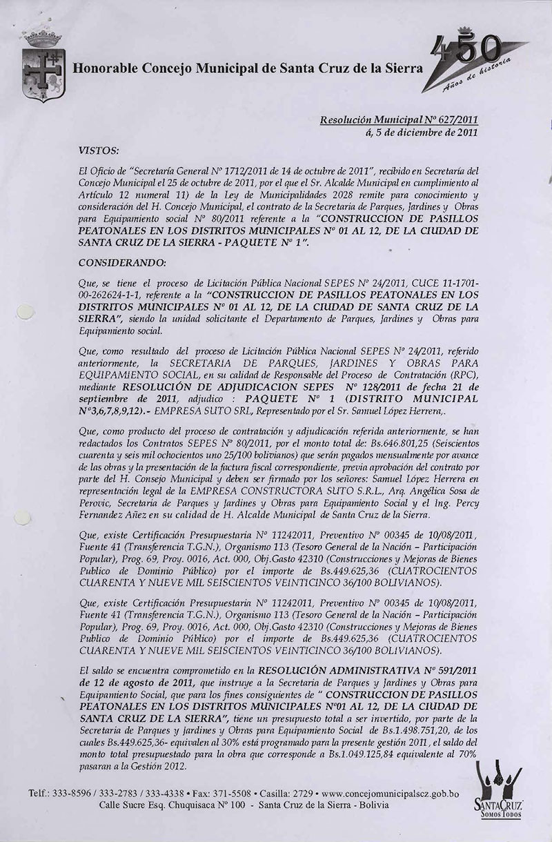 Aprueba Contrato de la Secretaria de Parques Jardines y Obras para Equipamiento Social Nº 80/2011, para la “CONSTRUCCION DE PASILLOS PEATONALES EN LOS DISTRITOS MUNICIPALES Nº 01 AL 12, por Bs. 646.801,25.