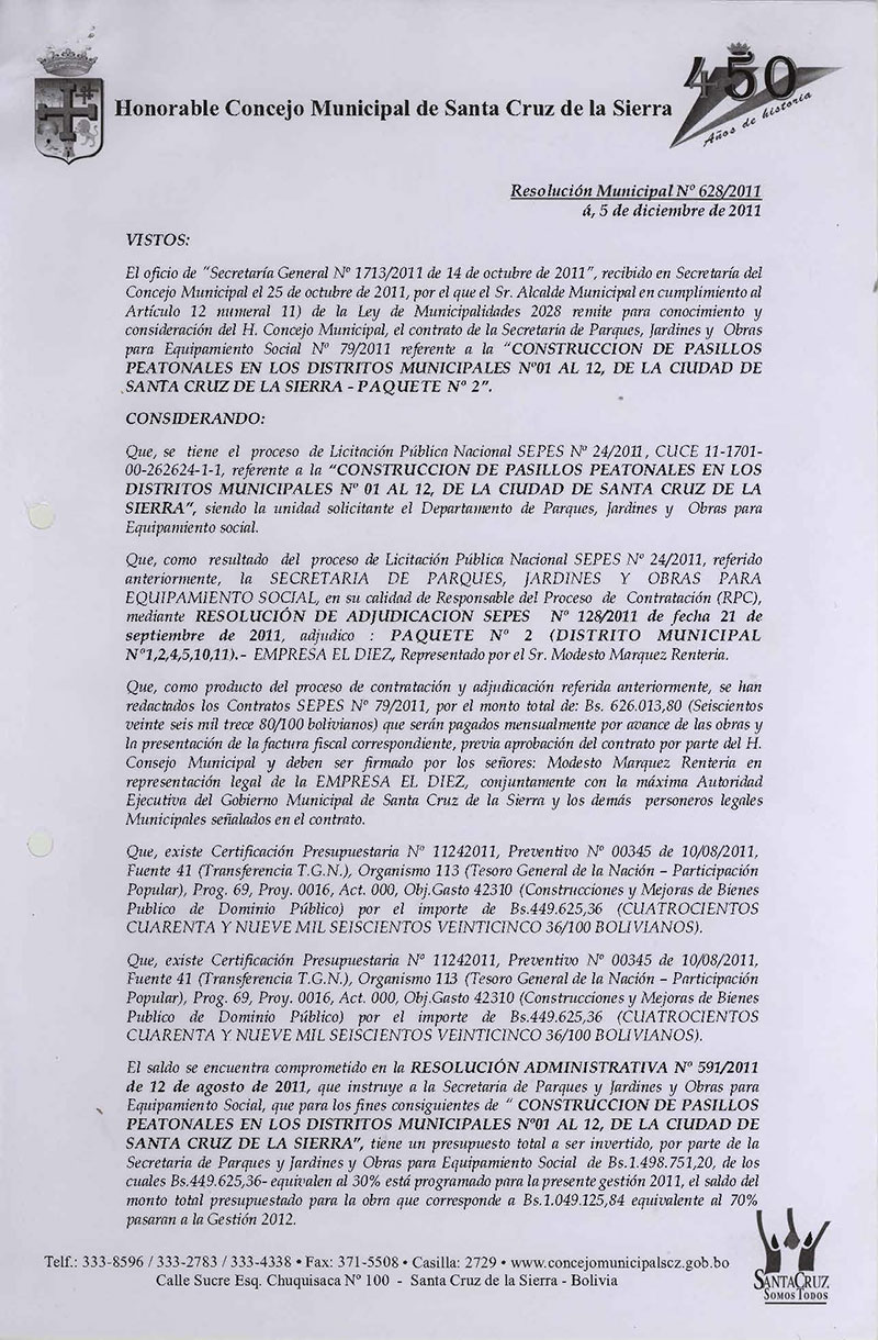 Aprueba el Contrato de la Secretaria de Parques Jardines y Obras para Equipamiento Social Nº 79/2011, para la “CONSTRUCCION DE PASILLOS PEATONALES EN LOS DISTRITOS MUNICIPALES Nº 01 AL 12, por Bs. 626.013,80.
