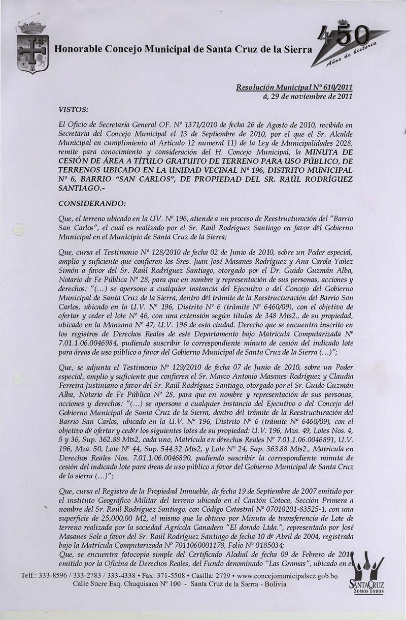 Aprueba la Minuta de Cesión de Terrenos para Uso Público y Terrenos en Custodia, que realiza el Señor Raúl Rodríguez Santiago, terrenos ubicados en la U.V. 196, Zona Nor-Este, Distrito Municipal Nº 6, Barrio “San Carlos”.