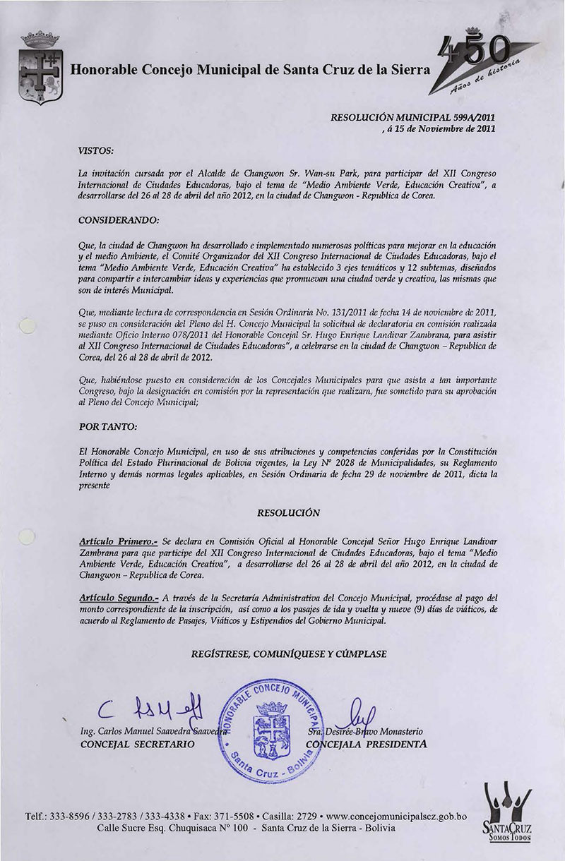 Declara en Comisión Oficial y se aprueba el viaje del Concejal Señor Enrique Landivar Zambrana, para que participe del XII Congreso Internacional de Ciudades Educadoras, bajo el tema “Medio Ambiente Verde, Educación Creativa”, a realizarse en Changwon – República de Corea.