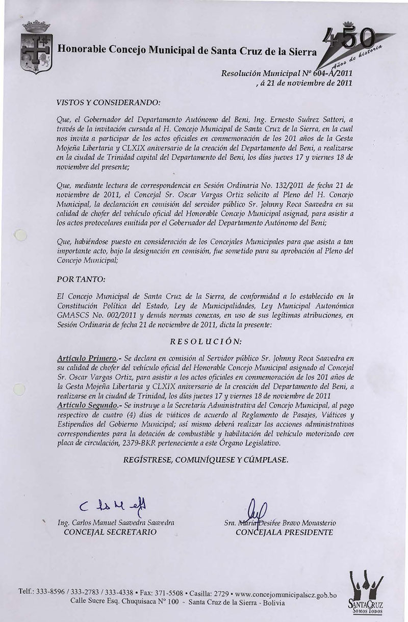 Declaran en comisión al Servidor Público Sr. Johnny Roca Saavedra, en calidad de chofer del vehiculo asignado al Concejal Vargas, para asistir a los actos oficiales en conmemoración de la Gesta Mojeña, del Departamento del Beni.