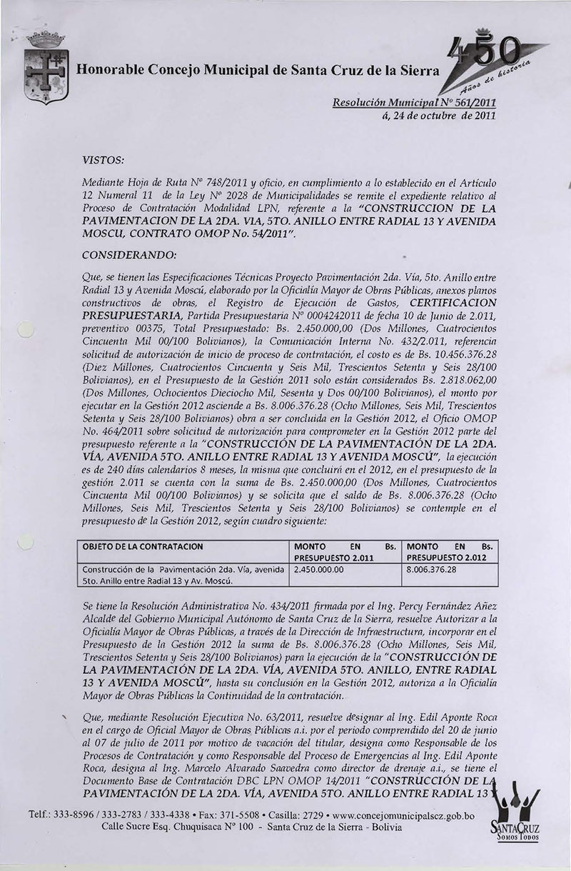 Aprueba el Contrato Modalidad Licitación Pública Nacional, OMOP No. 54/2.011, relativo a la “construcción de la pavimentación de la 2da. Vía 5to. Anillo, entre Radial 13 y Avenida Moscú”, por el monto de Bs. 7.000.696.35.