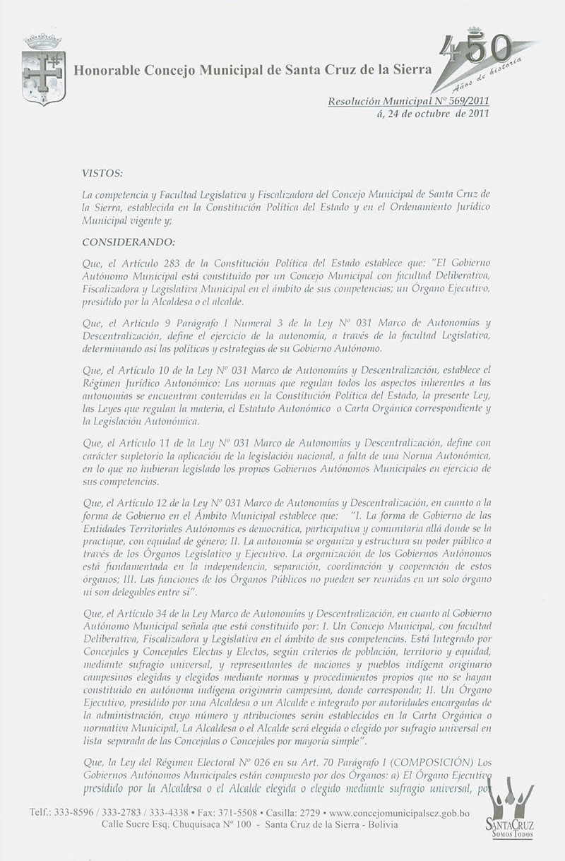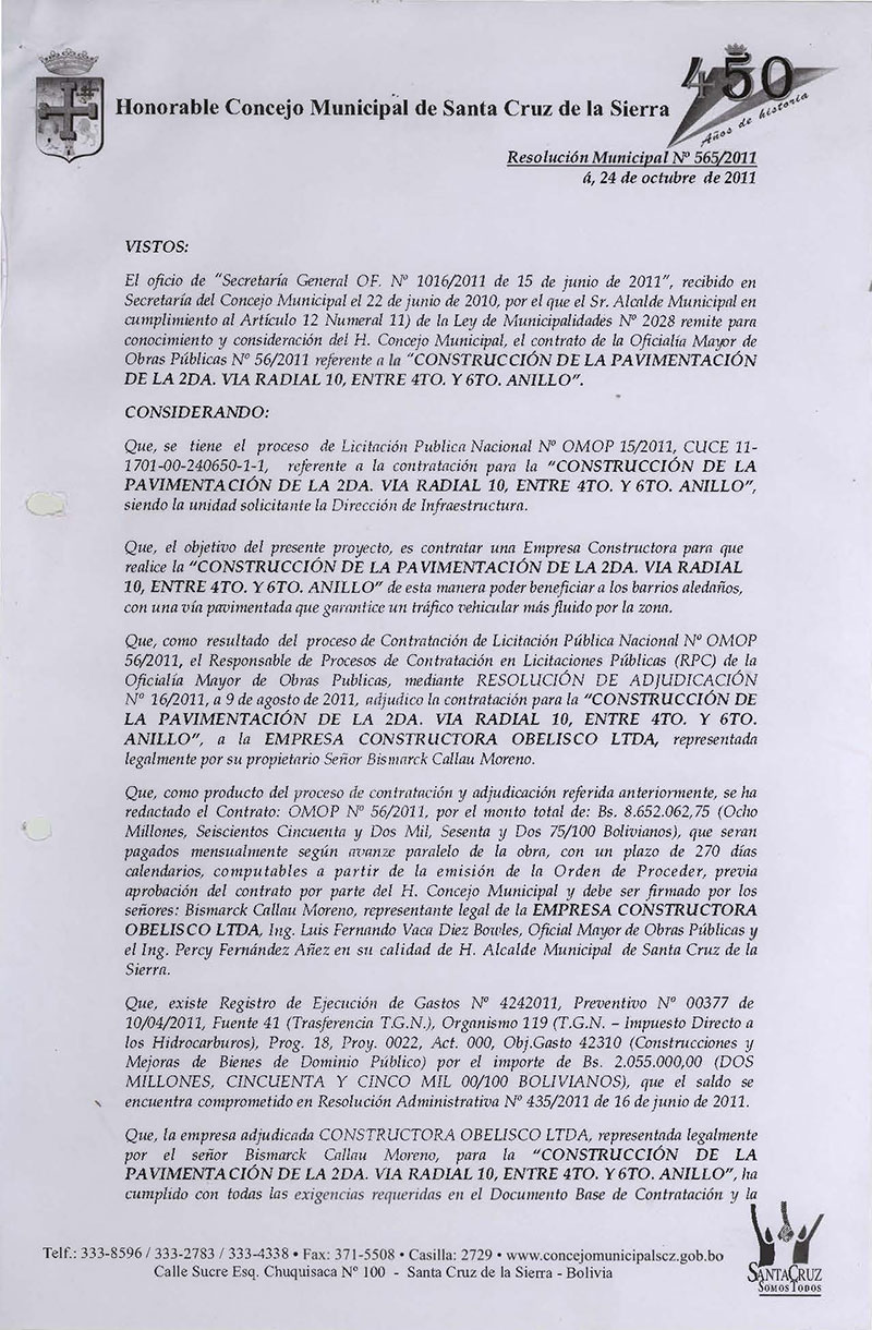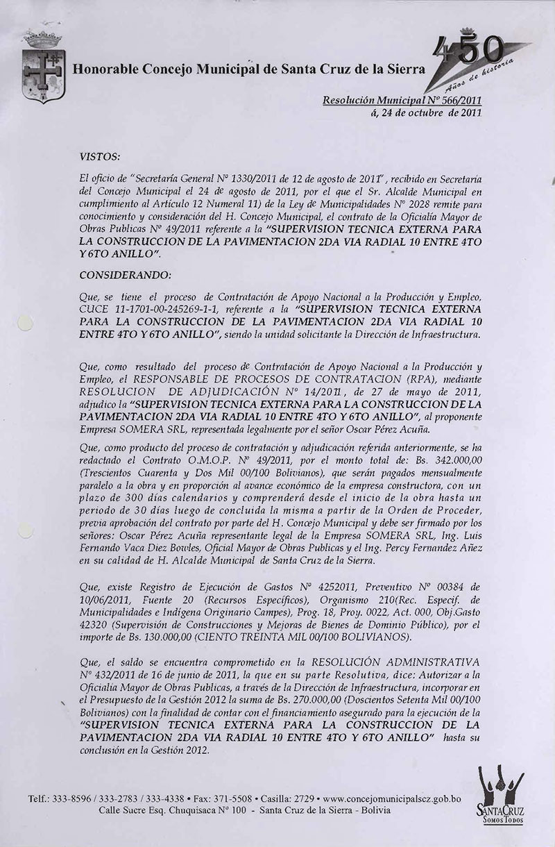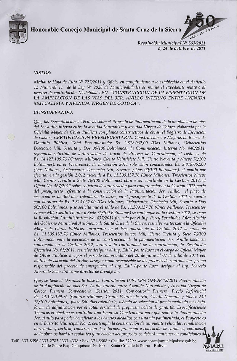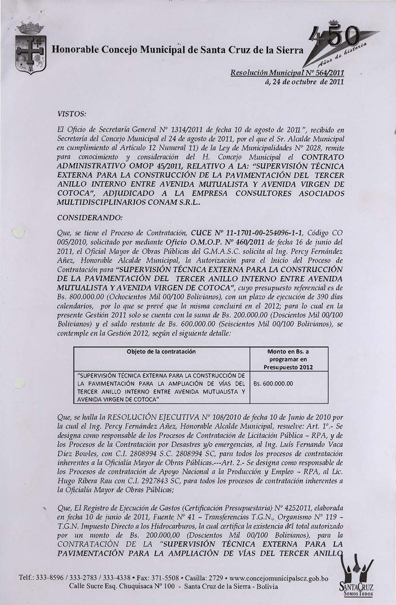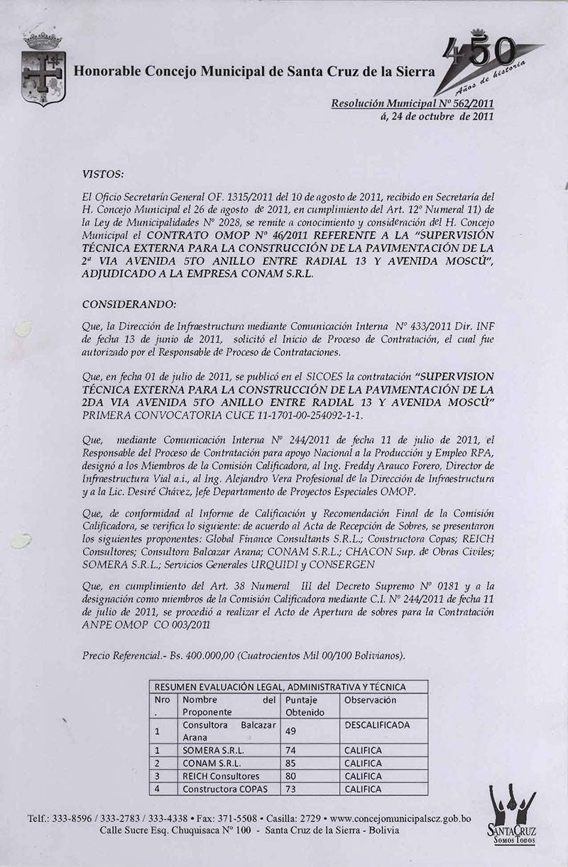 Aprueba el Contrato Modalidad Licitación Pública Nacional, OMOP No. 53/2011, relativo a la Construcción de la pavimentación de la ampliación de vías 3er. Anillo interno entre Avenida Mutualista y Avenida Virgen de Cotoca, por el monto de Bs. 11.089.936,43, adjudicado a la Empresa IASA LTDA.