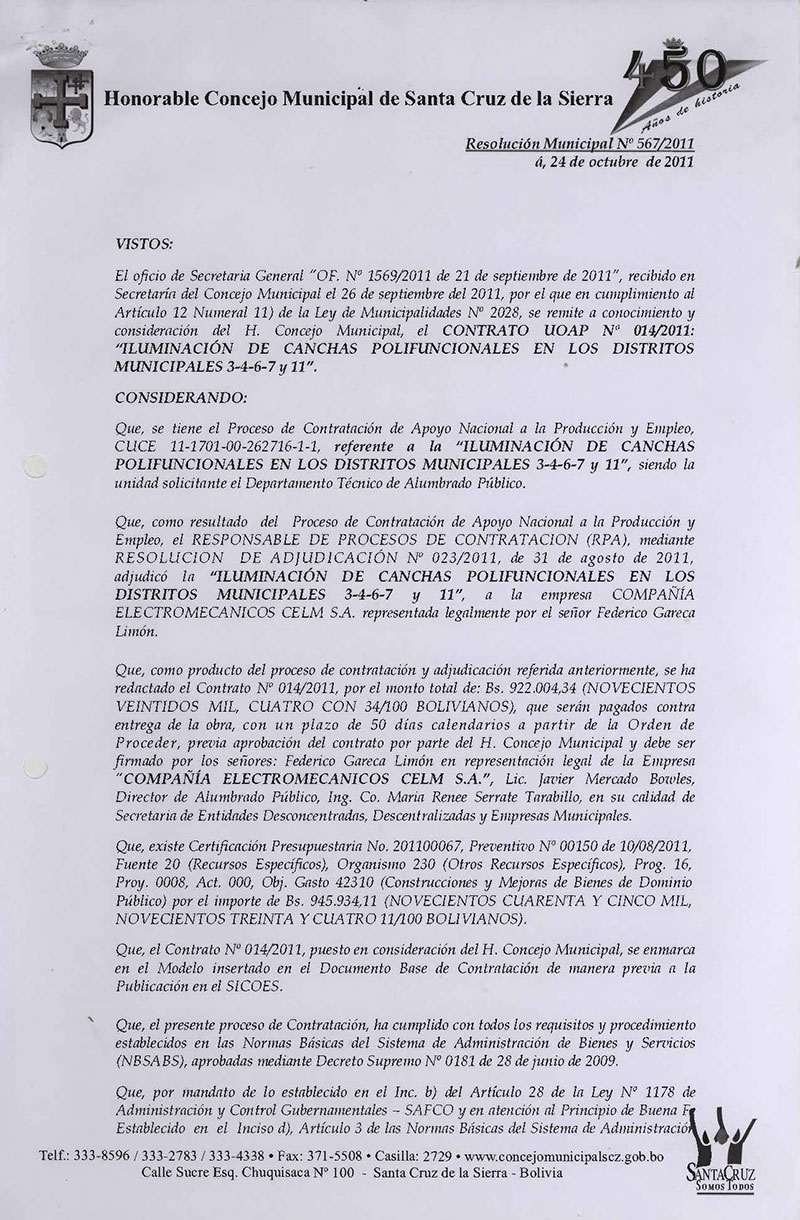 Aprueba el Contrato UOAP Nº 014/2011, para la “ILUMINACIÓN DE CANCHAS POLIFUNCIONALES EN LOS DISTRITOS MUNICIPALES 3-4-6-7 y 11”, por el monto de Bs. 922.004,34.