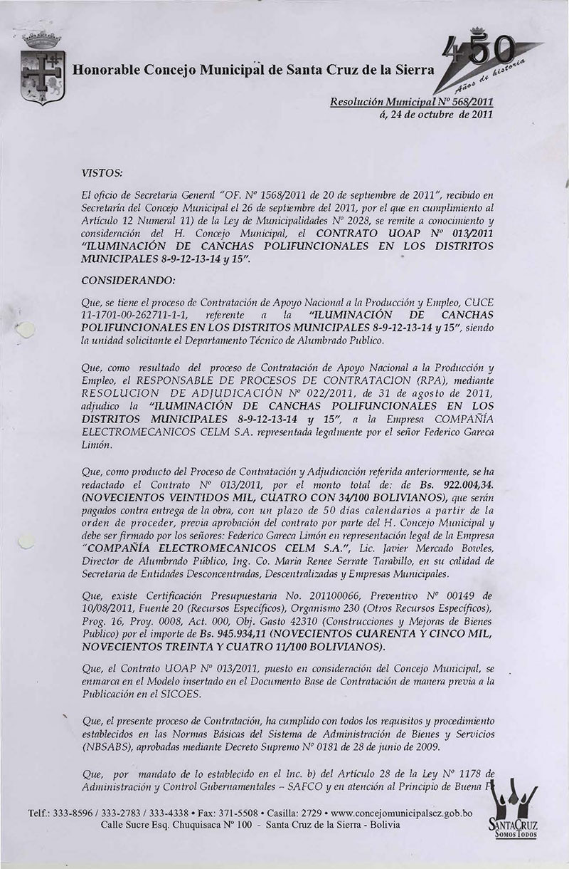 Aprueba el Contrato UOAP Nº 013/2011, para la “ILUMINACIÓN DE CANCHAS POLIFUNCIONALES EN LOS DISTRITOS MUNICIPALES 8-9-12-13-14 y 15”, por el monto de Bs. 922.004,34.
