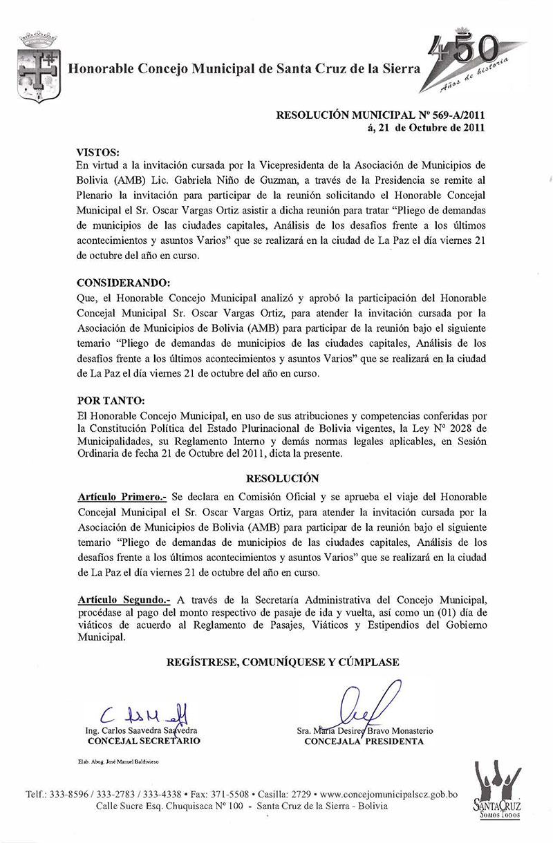Declara en comisión y se aprueba el viaje del Concejal Sr. Oscar Vargas, para antender la invitación de la Asociación de Municipios de Bolivia - AMB, que se realizará en la ciudad de La Paz.