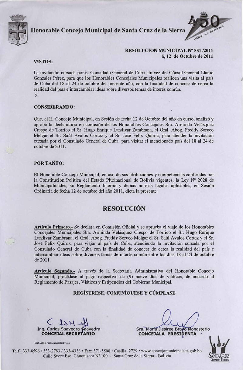 Declara en Comisión Oficial y aprueba viaje de los Concejales Sra. Arminda Velásquez. Sr. Hugo Enrique Landivar, Abog. Freddy Soruco, Lic. Saúl Avalos y el Sr. José Felix Quiroz, para viajar a Cuba.