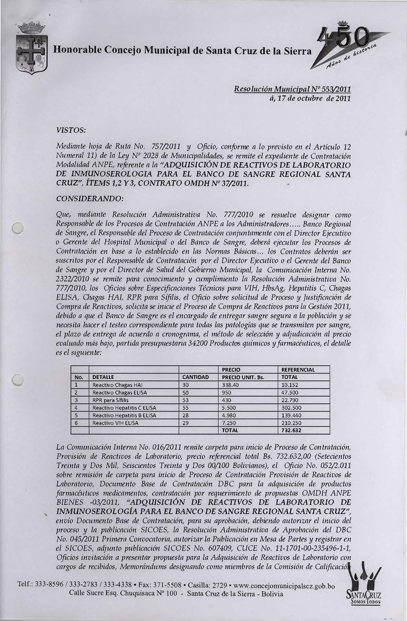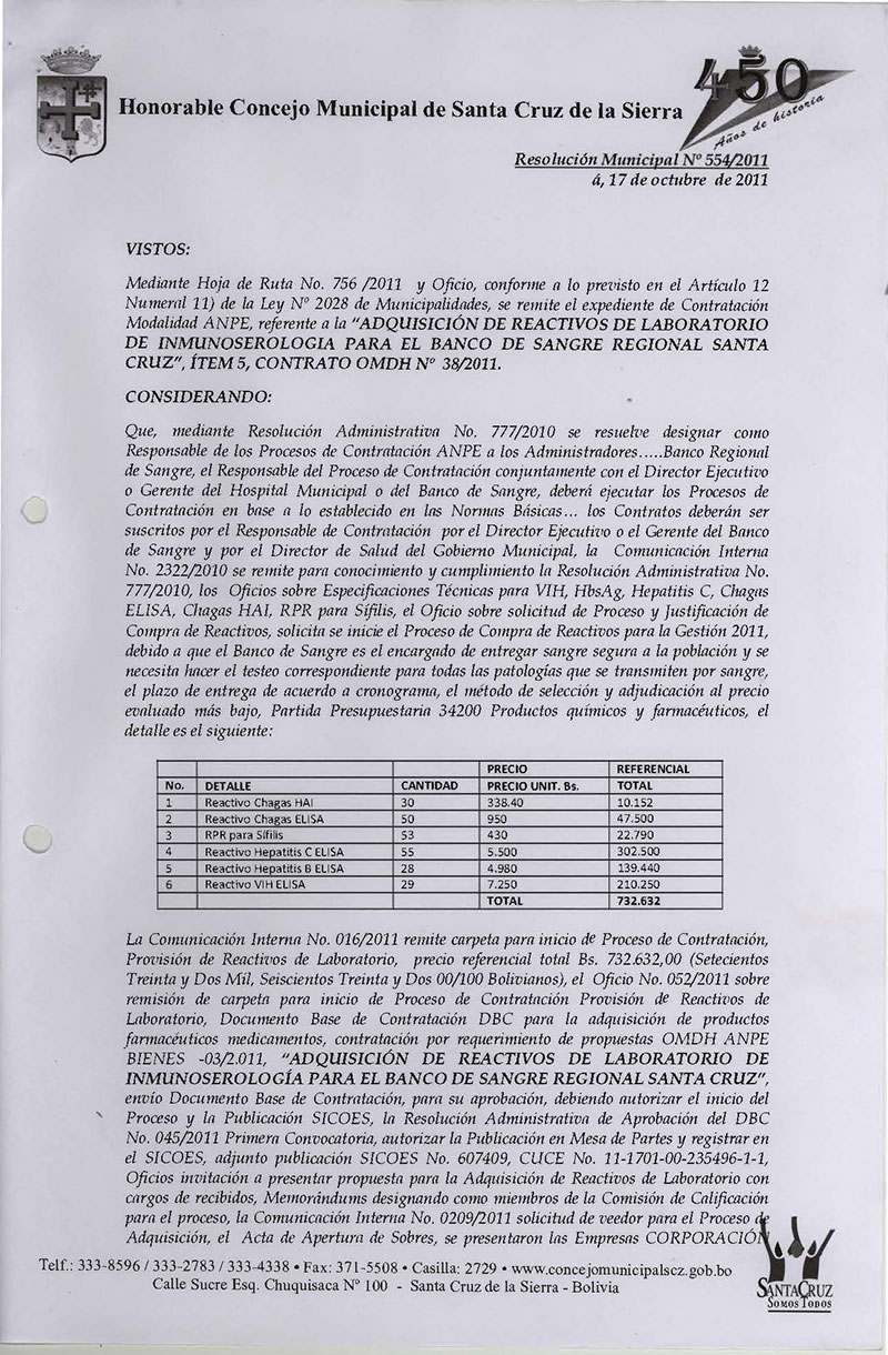Aprueba el proceso de Contratación Modalidad ANPE Contrato Nº 038/2011, referente a la “Adquisición de reactivos de laboratorio de inmunoserología para el Banco de Sangre Regional Santa Cruz”.
