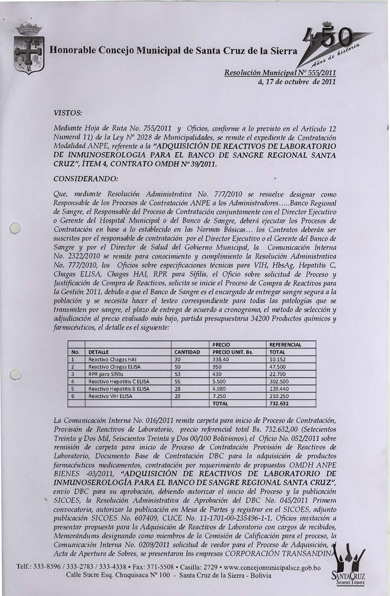 Aprueba el proceso de Contratación Modalidad ANPE Contrato Nº 039/2011, referente a la “Adquisición de reactivos de laboratorio de inmunoserología para el Banco de Sangre Regional Santa Cruz”.