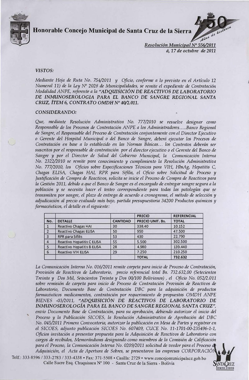 Aprueba el proceso de Contratación Modalidad ANPE Contrato Nº 040/2011, referente a la “Adquisición de reactivos de laboratorio de inmunoserología para el Banco de Sangre Regional Santa Cruz”.