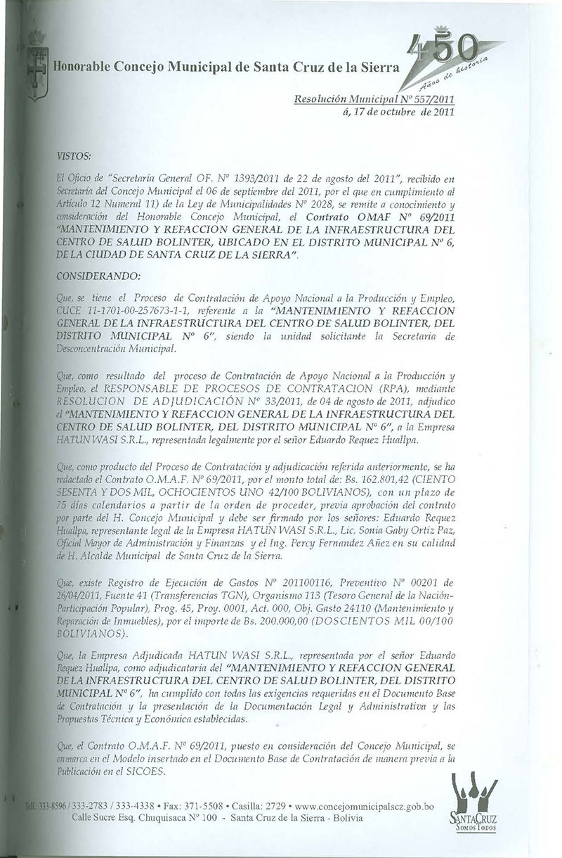 Aprueba el Contrato OMAF Nº 69/2011, para el “MANTENIMIENTO Y REFACCIÓN GENERAL DE LA INFRAESTRUCTURA DEL CENTRO DE SALUD BOLINTER, DEL DISTRITO MUNICIPAL Nº 6, por el monto de Bs. 162.801,42.