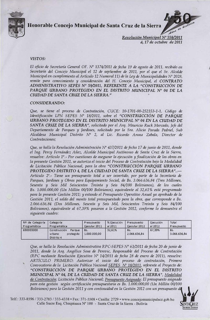 Aprueba el CONTRATO ADMINISTRATIVO SEPES Nº 59/2011, relativo a la “CONSTRUCCIÓN DE PARQUE URBANO PROTEGIDO EN EL DISTRITO MUNICIPAL Nº 04 DE LA CIUDAD, por el monto de Bs. 2.358.139,98.