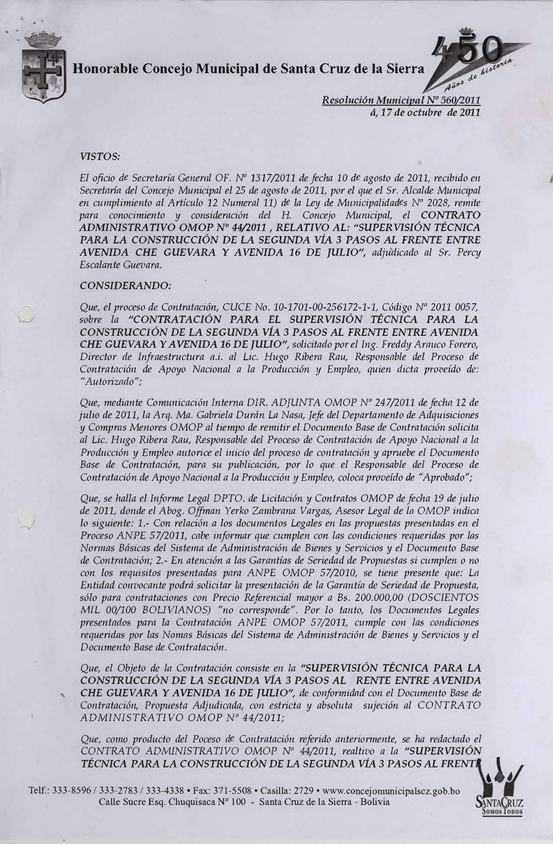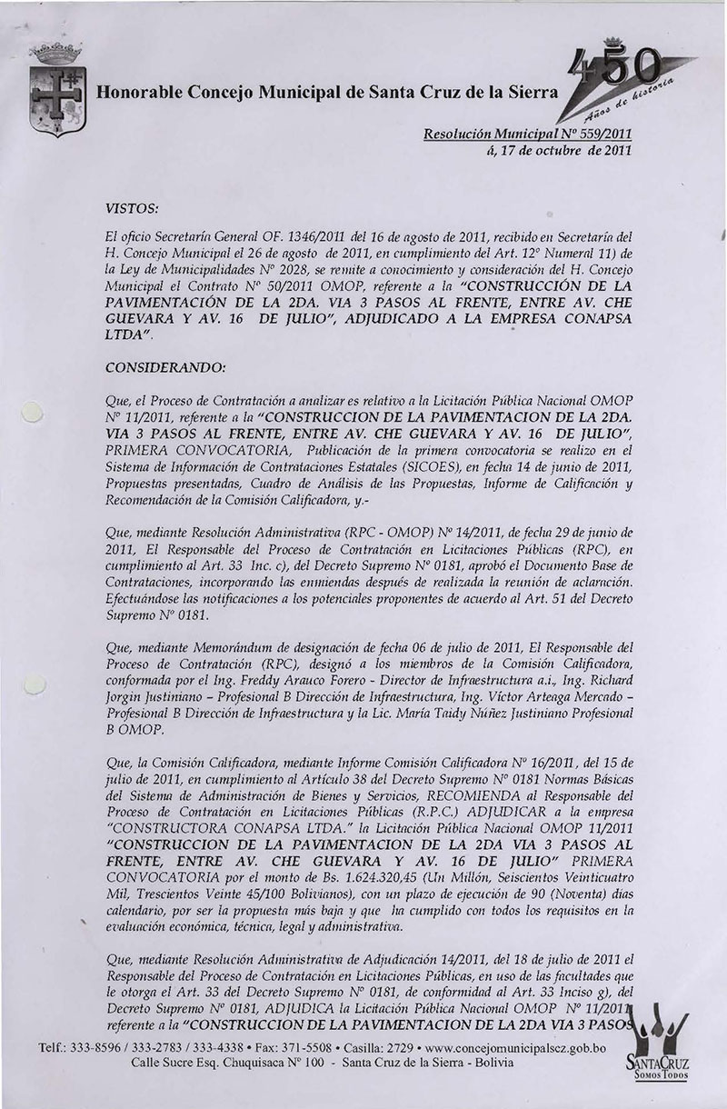 Aprueba el Contrato Nº 50/2011 OMOP referente a la “CONSTRUCCIÓN DE LA PAVIMENTACIÓN DE LA 2DA. VIA 3 PASOS AL FRENTE, ENTRE AV. CHE GUEVARA Y AV. 16 DE JULIO”, por el monto de Bs. 1.624.320,45.