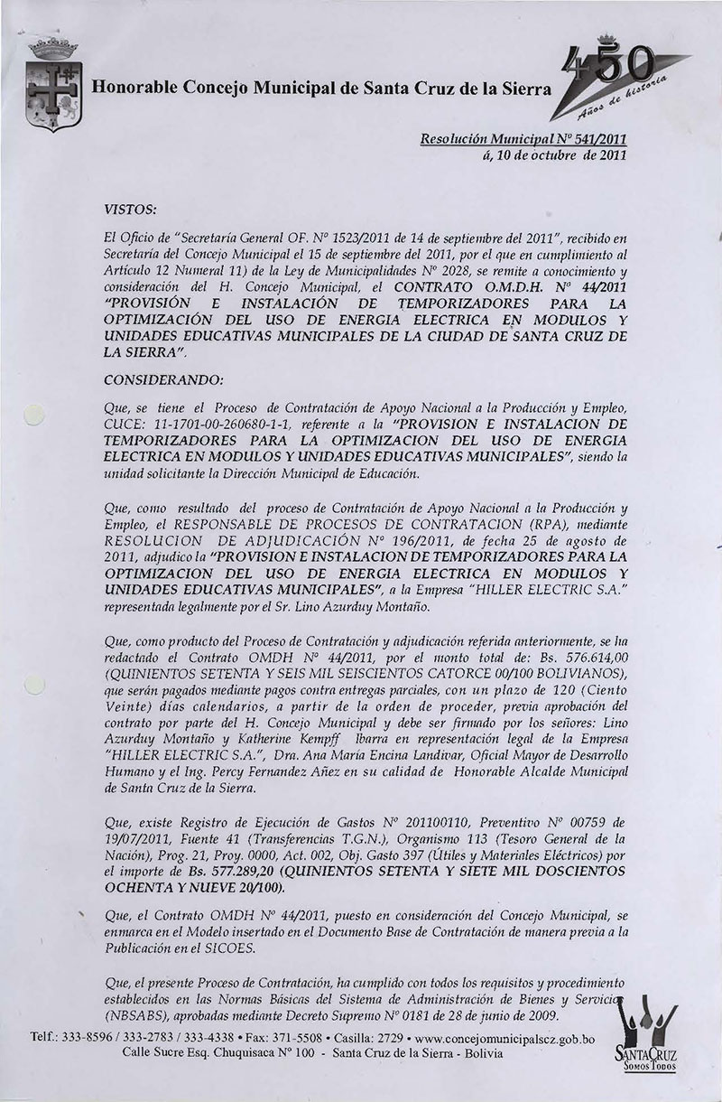 Aprueba el CONTRATO OMDH Nº 44/2011, para la “PROVISIÓN E INSTALACIÓN DE TEMPORIZADORES PARA LA OPTIMIZACIÓN DEL USO DE ENERGIA ELECTRICA EN MODULOS Y UNIDADES EDUCATIVAS MUNICIPALES DE LA CIUDAD, por el monto de Bs. 576.614,00.